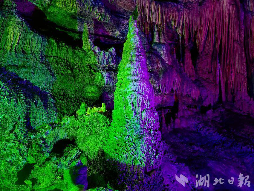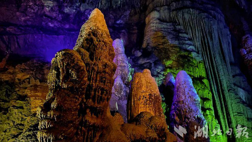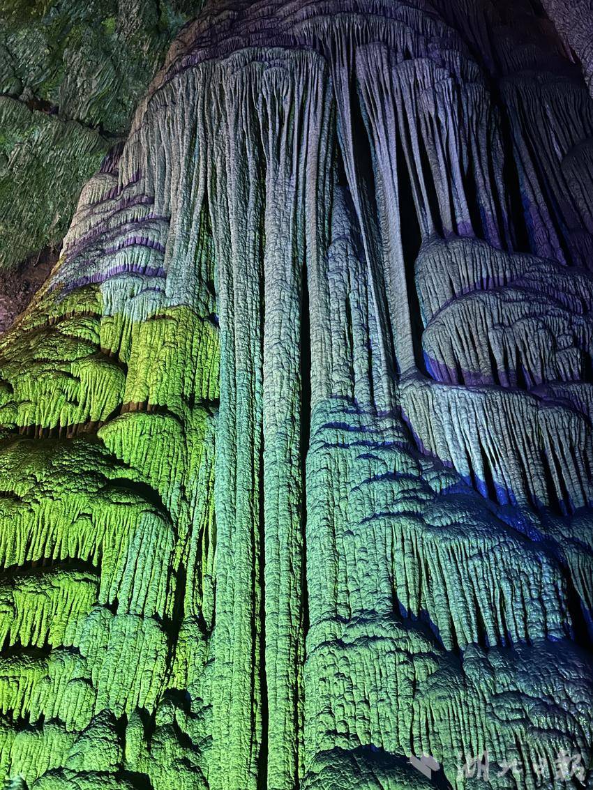 步入洞内,似踏入神秘的地下王国。怪石嶙峋,石钟乳如艺术珍品垂落,有的似利剑,有的若仙女;石笋似大地精灵崛起,有的如春笋萌动,有的如巨柱擎天。雄伟的石柱连接洞顶与地面,犹如大自然的杰作。在灯光下,地质景观绚丽多彩,蓝色灯光让石钟乳如深海宝藏般神秘莫测;黄色灯光使石笋似金色希望般熠熠生辉。这里尽显大自然的鬼斧神工,让人如入奇幻的童话世界,沉醉难返。每处景观都似在诉说古老的故事,令人流连忘返。