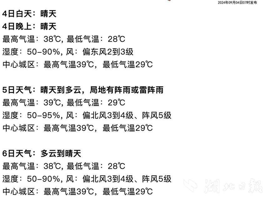 预计未来一周武汉市高温维持,5日受弱冷空气影响,武汉市有分散性阵雨或雷阵雨,局地有雷暴大风、短时强降水等强对流天气。
