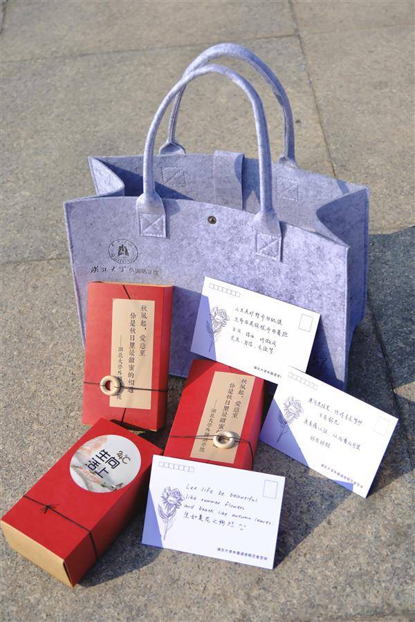 物理学院为新生送上融入湖大校园文化特色和四季元素的精美书签;资源环境学院发放杜邦纸袋、种子书签;外国语学院则由学长学姐为新生们提笔书写明信片,礼物盒上还写有“你是秋日里最甜蜜的相遇”。