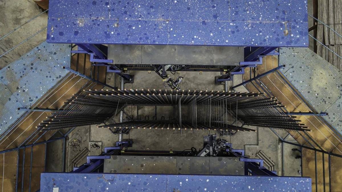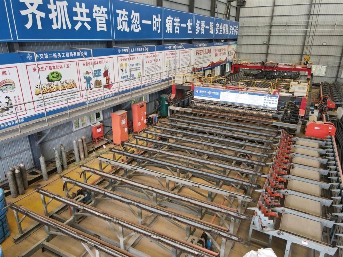 丹江小三峡特大桥南主塔高206米,传统筑塔机需20多名工人塔上作业,危险系数高,施工时间长。中交二航局研发第三代一体化智能筑塔机,它集成钢筋部品组拼、架体智能同步爬升模板拆合与混凝土布料、振捣养护等多功能于一体,形成全封闭的塔上移动工厂作业环境,提高工人作业安全系数。此外,建设团队应用TD6000-30钢筋网片柔性制造生产线、拉钩筋自动穿插机器人,确保钢筋的间距、保护层厚度合格率达到100%。