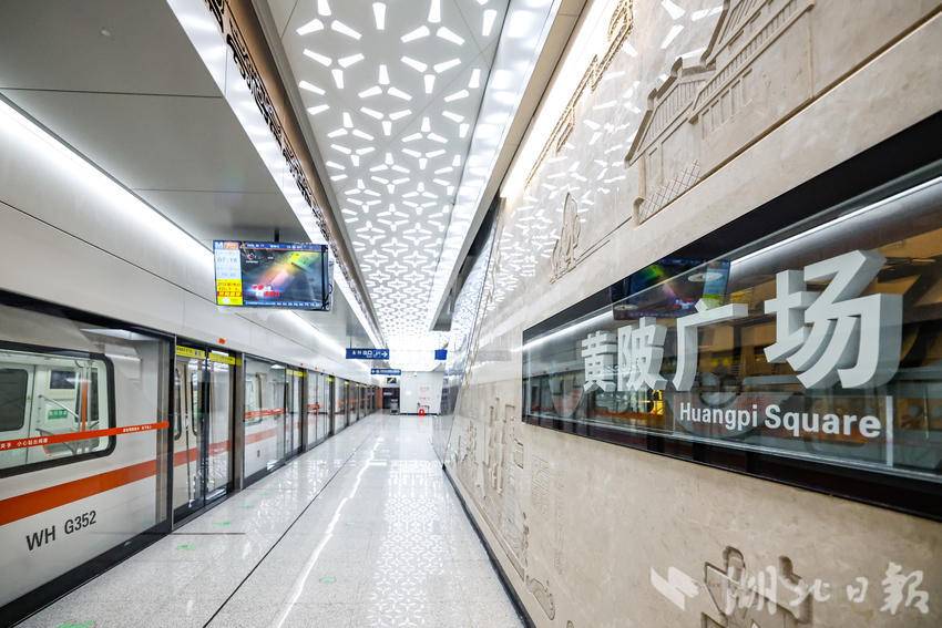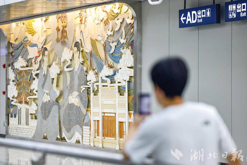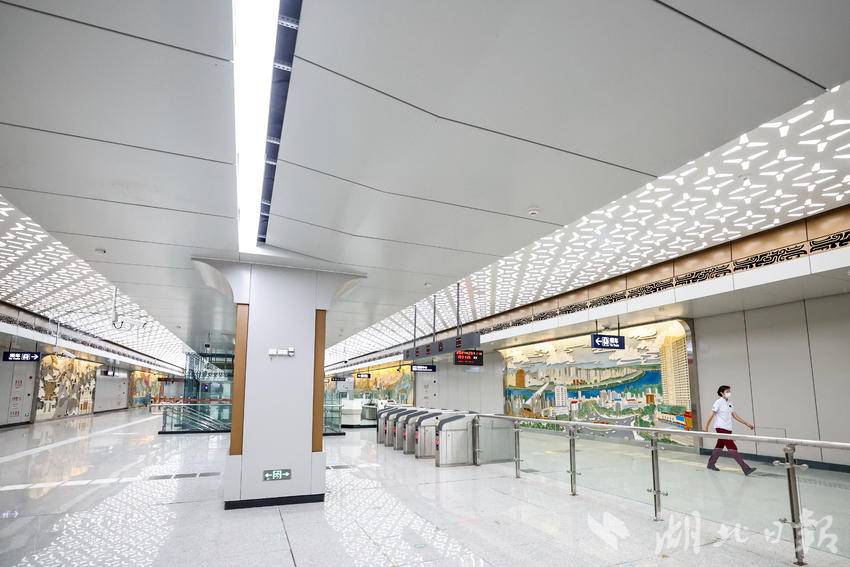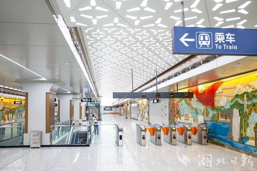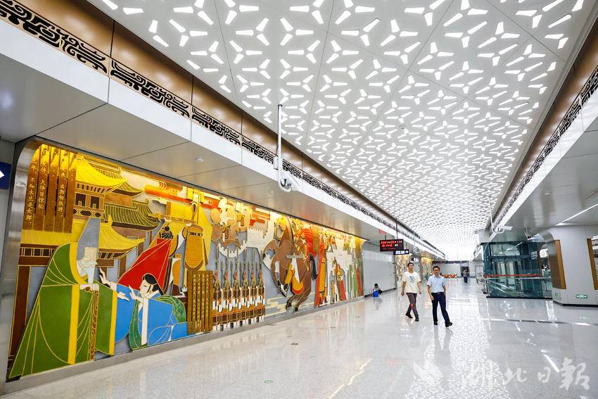 9月11日,在武汉地铁前川线二期黄陂广场站厅内,充满特色的艺术墙展现了黄陂特有的文化风貌,成为该区对外形象展示的重要地标。据介绍,该车站主题为“木兰盛景”,站内将盘龙文化,木兰花景、民居建筑等独特的文化元素提炼成几何形态,巧妙设计于天花柱面中,每一面艺术墙都讲述着不同的地域故事,一站一景的艺术空间为乘客展现了黄陂的魅力景象。前川线二期工程线路建成运营之后,将黄陂、盘龙城、东西湖片区连成一个整体,提升天河机场枢纽集散能力,助力武汉北部经济发展。(湖北日报全媒记者 倪娜 通讯员 曾斯 袁永华 摄)