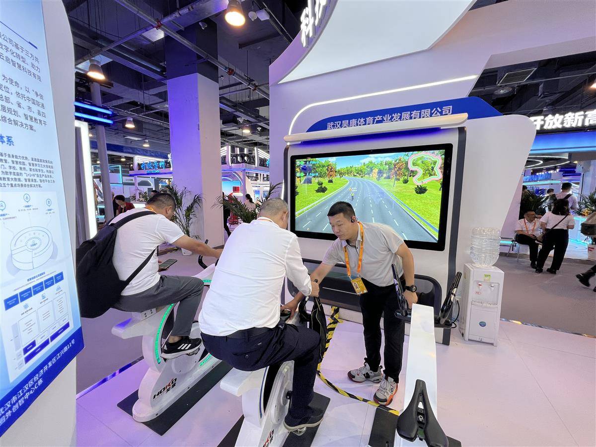观众体验AI虚拟骑行自行车。(湖北日报全媒记者 林晶 摄)