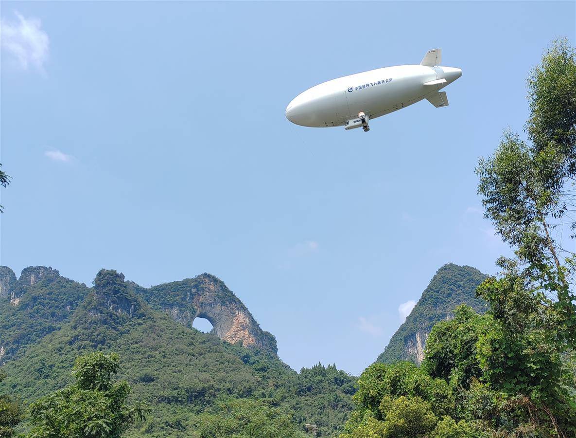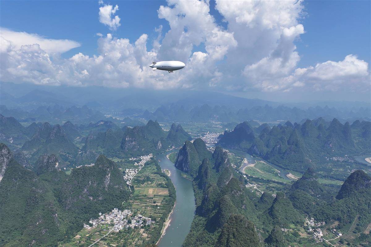 记者现场看到,一架外形圆润可爱、线条优美流畅、颜色洁白干净的“祥云”AS700,头锥佩戴鲜艳的“大红花”惊艳亮相。在众人的目光下,飞艇轻盈腾空,扶摇直上,宛如一只“空中白鲸”遨游在云山雾海之中。经过阳朔多个标志景点后,飞艇稳稳降落,圆满完成演示飞行。