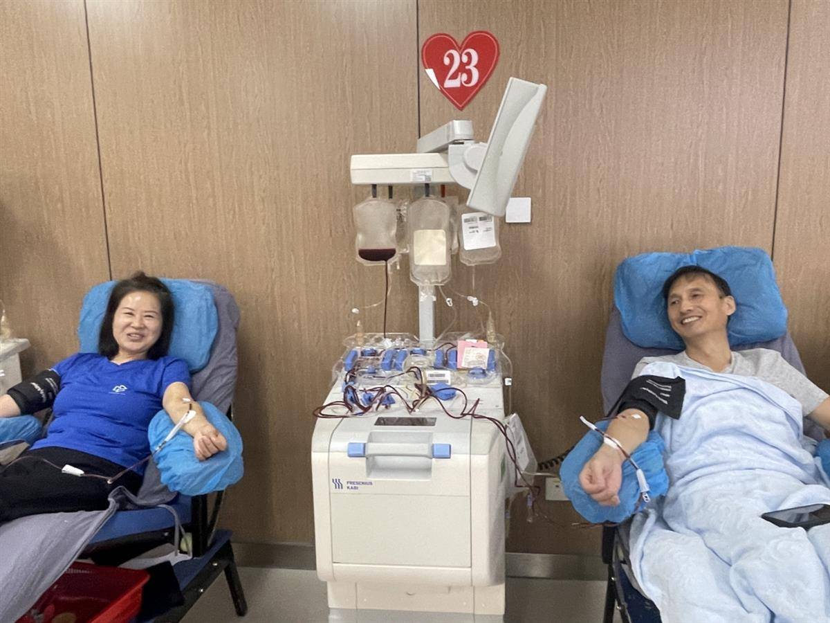 9月13日,刘晓红和张绍权一起坐上采血椅,边献血边聊天。(肖莉娇 摄)