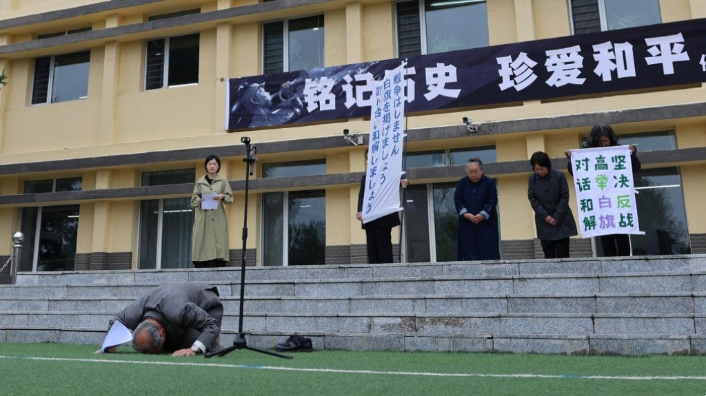谢罪仪式现场,另有4名侵华日军后代站在台上一同表达谢罪之情。他们手中举着白旗,上面分别用中文、日文书写着“坚决反战、高举白旗、对话和解”。