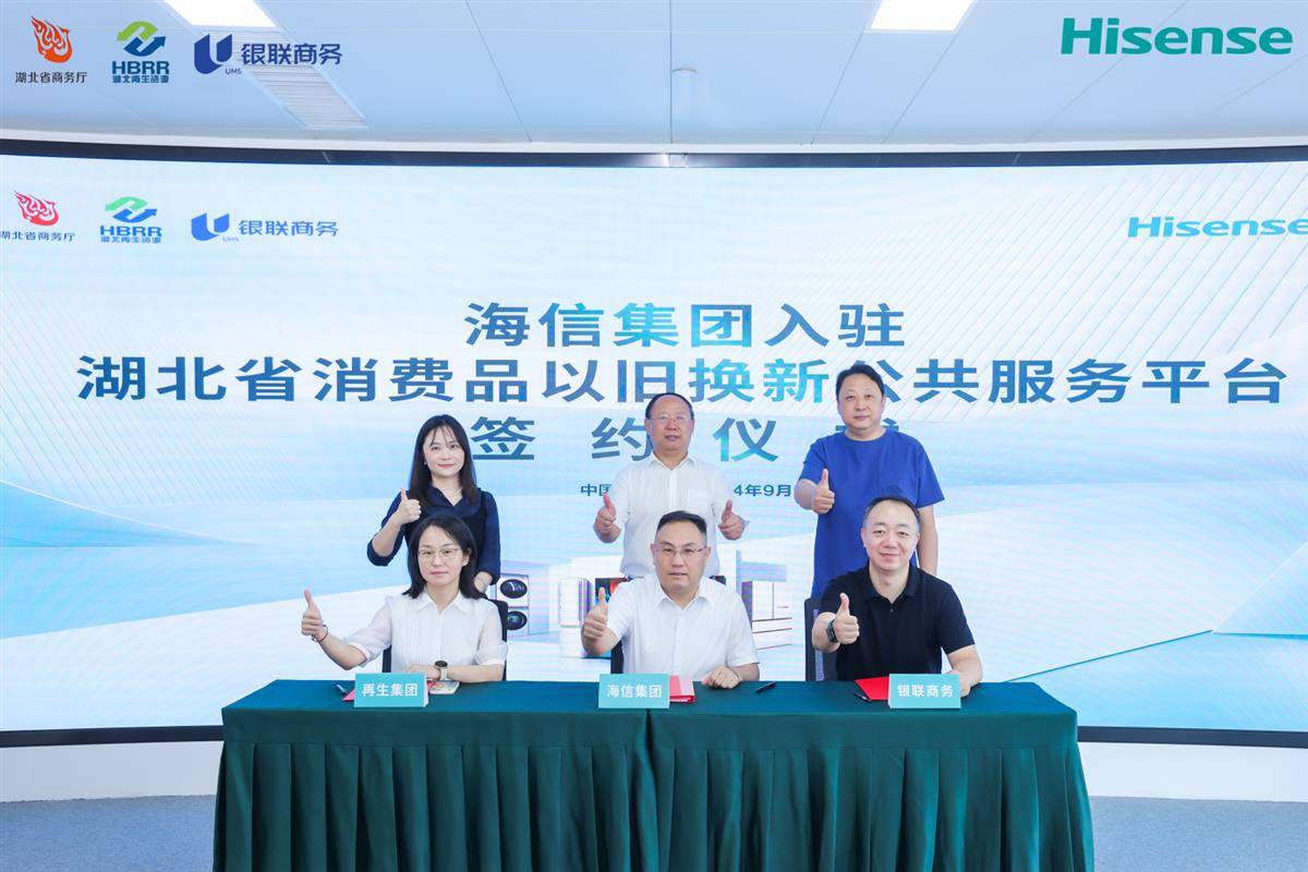 湖北日报讯(记者陈莉霖、通讯员李江浩)消费者将有更多、更方便的渠道,享受家电以旧换新优惠。9月18日,在湖北省商务厅指导下,湖北省再生资源集团有限公司、银联商务支付股份有限公司湖北分公司、海信(武汉)销售有限公司举行三方签约,海信集团在湖北的1000余个销售网点可让更多居民在家门口以旧换新。