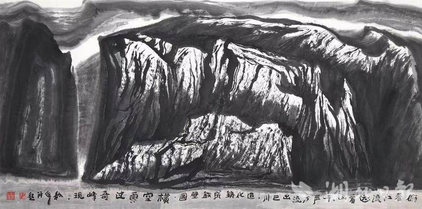 西南大学美术学院教授戴政生常年跋涉和创作于长江三峡流域,经长期构思,他选择风帆作为画面主旋律符号,创作了高3米,长20多米乃至60米的套色版画《回忆长江》。他说,创作这件超大木刻版画时,常处于亢奋之中,这些巨型风帆似刀削陡峭的三峡峰峦,似巴渝山民锋利的砍刀,是艺术之帆,也是自己的精神源泉。