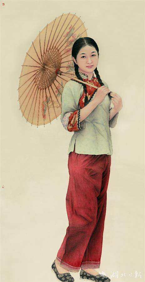 值得一提的是,参展作品不乏国内顶尖的精品力作。中国美术家协会主席范迪安的油画《时代新貌》,描绘长江重庆段的新气象;中国国家画院院长刘万鸣的国画《沉静的大自然》,表现国宝大熊猫之趣;中国国家画院原院长卢禹舜的国画《黄鹤楼》,表达对武汉抗疫的感悟。湖北著名画家周韶华的纸本水墨《造化铸成铁壁图》,对峡江风光进行了笔墨转换,以干湿笔法皴擦的山体呈现巨大的体量,与水墨渲染的长河,形成强烈对比,造成撼人气势;李乃蔚的工笔画《撑花》用写实细腻的笔触描绘一位身着民族服饰的少女落雨撑伞的情景,雨伞像花,把少女衬托得更加恬静可人。