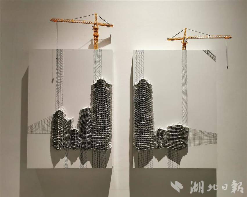 安徽省美术家协会会员方宇的布面油彩《东瞰·激流》,描绘现代长江港口繁忙景象,借助宏大的画面及细腻的笔触、富有动感的色彩,展现长江作为中国重要经济命脉的活力。江西省美术家协会实验艺委会副秘书长谭丹武的综合材料作品《线性城市之双子塔》,以南昌标志性建筑为创作素材,加入动态装置,看起来既非常当代,又处处体现传统审美。中国美术家协会油画艺术委员会副主任杨参军、中国美术学院教师王乐其合作创作的油画《致蔚蓝——开展浙江海洋经济发展示范区建设》,以写实的手法,采取了多轴、多层次的方式来表现主题。上海美术家协会顾问李向阳的布面油画《饮水思源——记青草沙原水水源地工程》,俯瞰视角下的青草沙原水水源地工程,宛若长江口一颗“祖母绿”,诗意诉说着水源地的壮美。