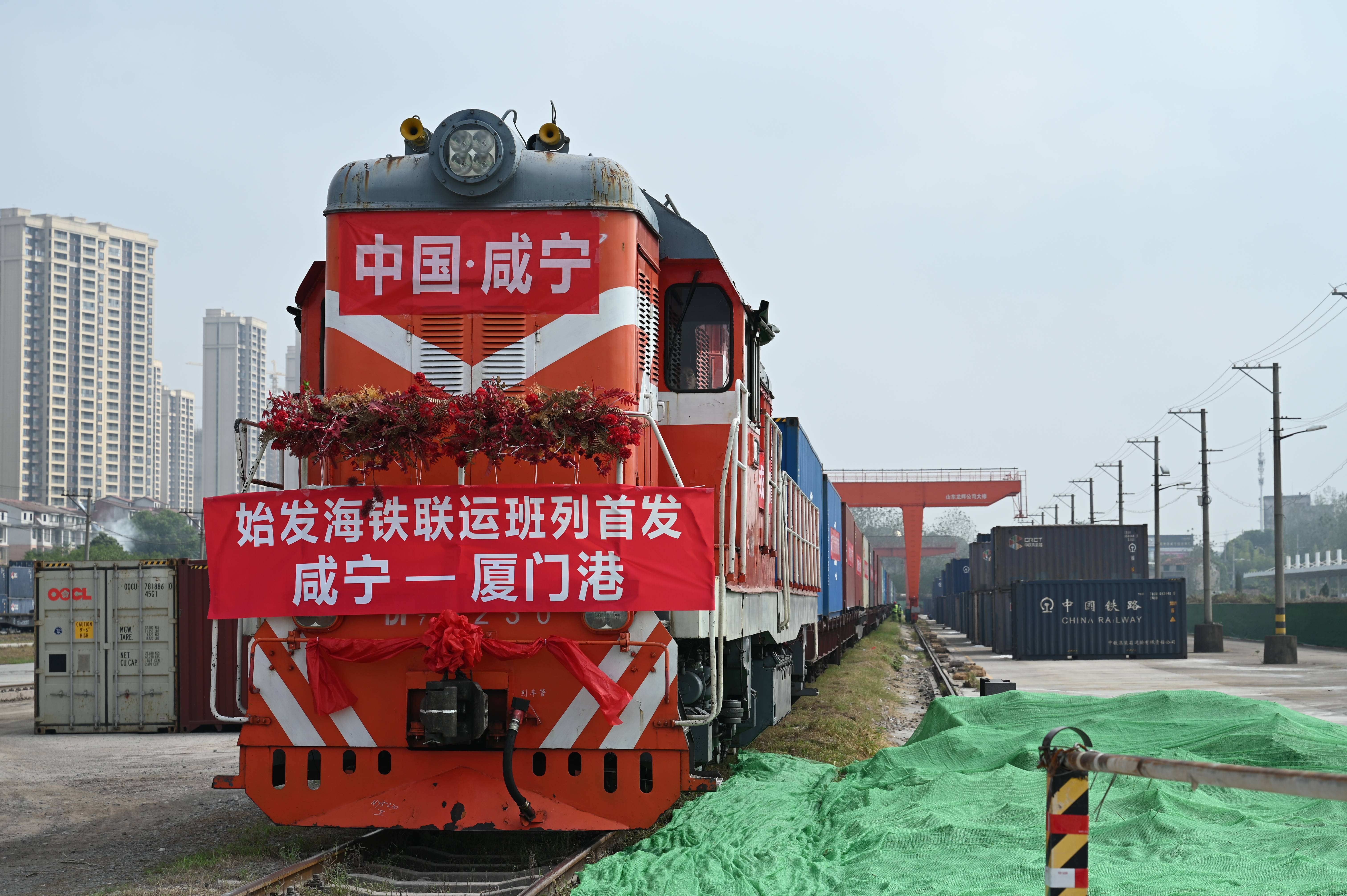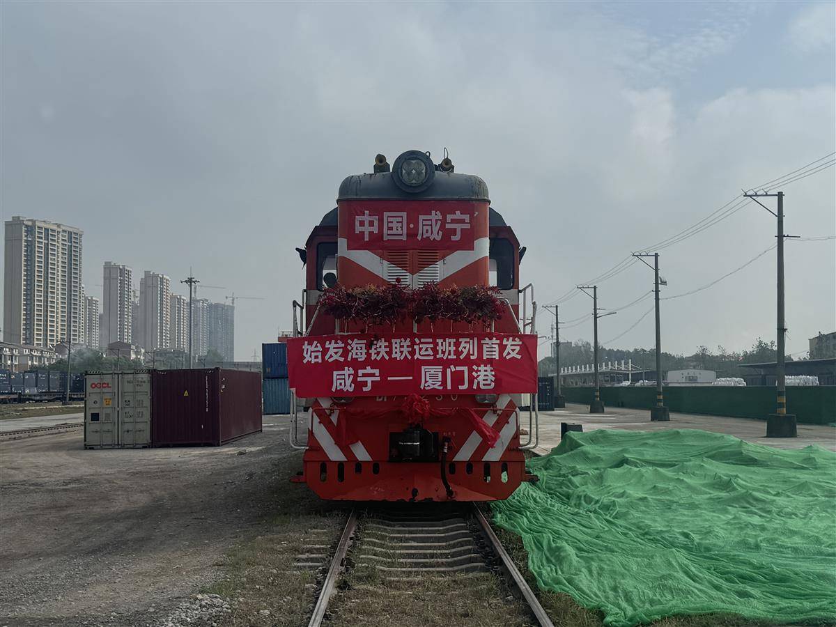 这是从咸宁始发的首列海铁联运班列,由咸宁国际陆港、武汉中远海运集装箱运输有限公司和厦门港务控股集团有限公司三方联合组织开行,运输的出口商品均为“咸宁制造”,包括汽车配件、电器、医疗用品、生活用品等。