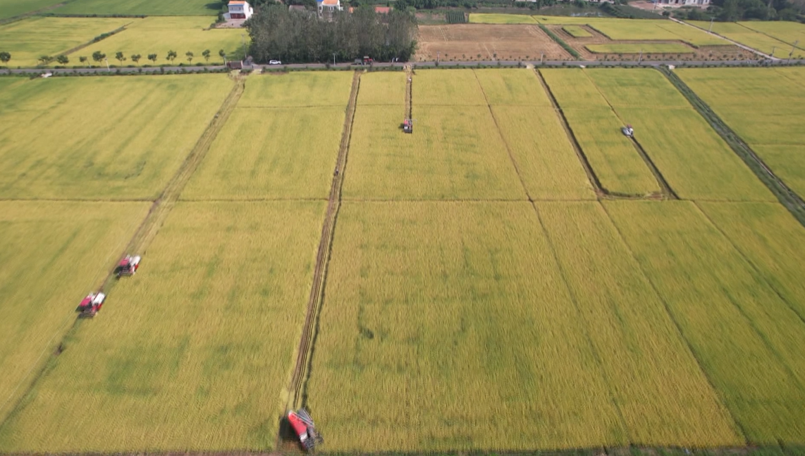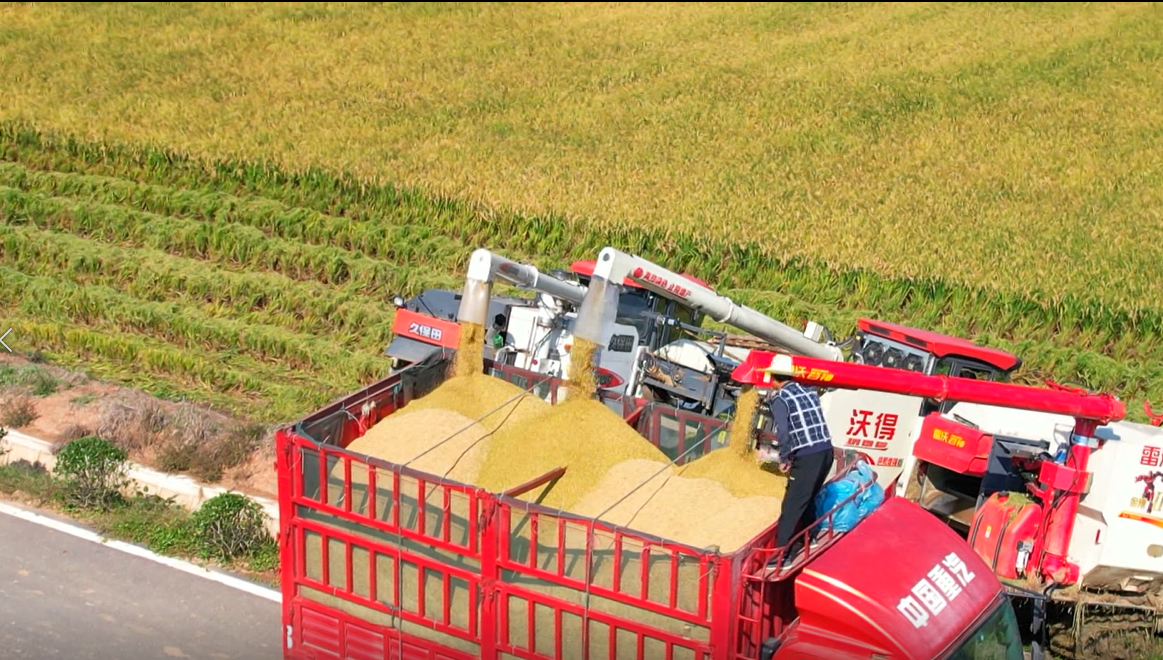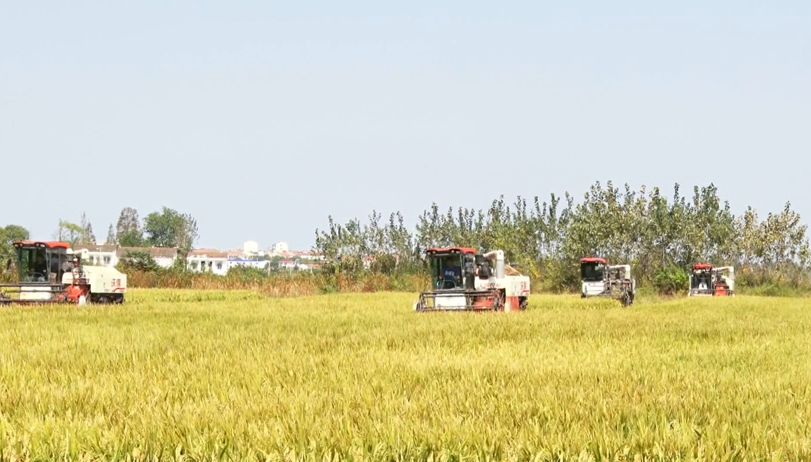 在应城市田店镇畅马村,5台大型收割机在金灿灿的稻田里来往穿梭, 全面展示应城糯稻丰产收割的繁忙景象。