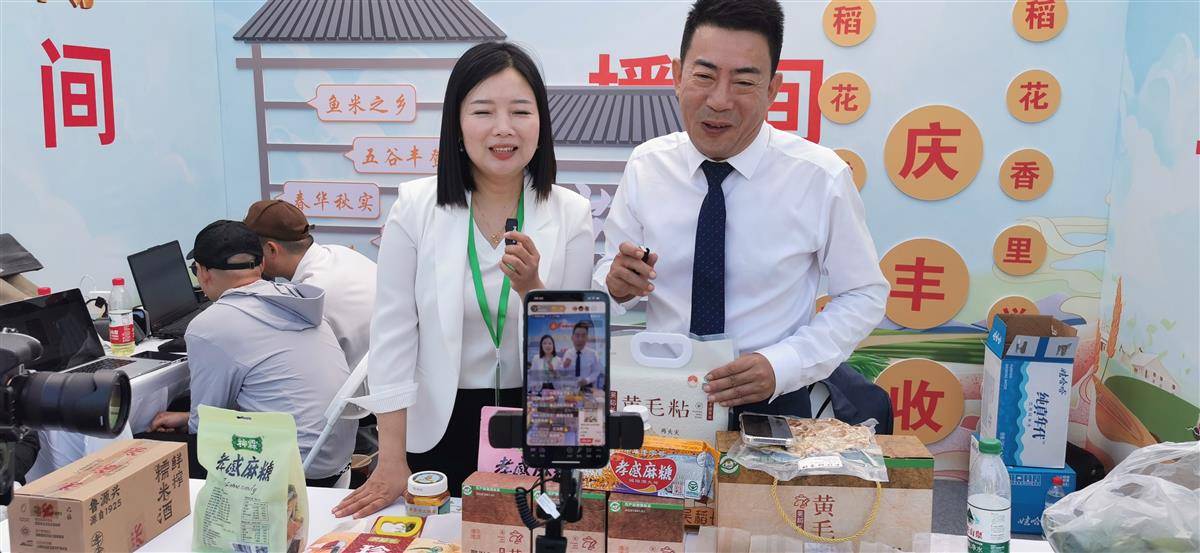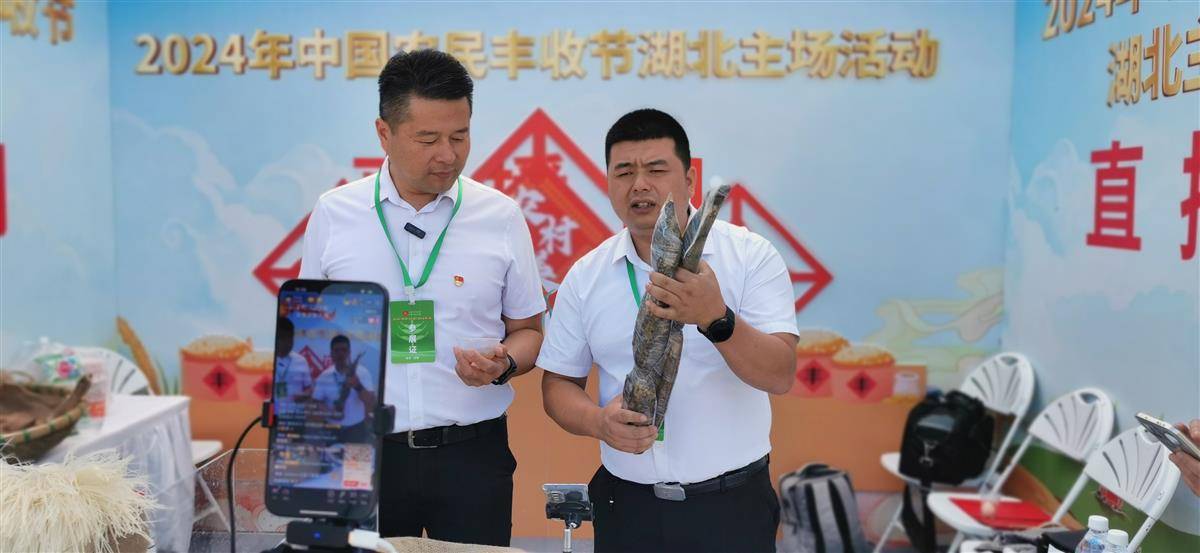 鸡蛋、莲藕、甲鱼、米粉、紫薯……七八种农产品摆在台上,两位大老爷们儿联袂直播带货,线上线下引来广泛关注。