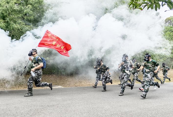 华中科技大学新生在进行防化演练