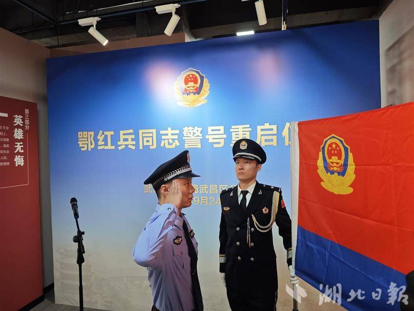 “032078报到!”“归队!”9月24日,武汉市公安局武昌区分局举行因公牺牲民警鄂红兵“警号重启”仪式。时隔一年八个月后,鄂红兵的警号“032078”重新启用,挂在他的儿子——新警鄂靖胸前。