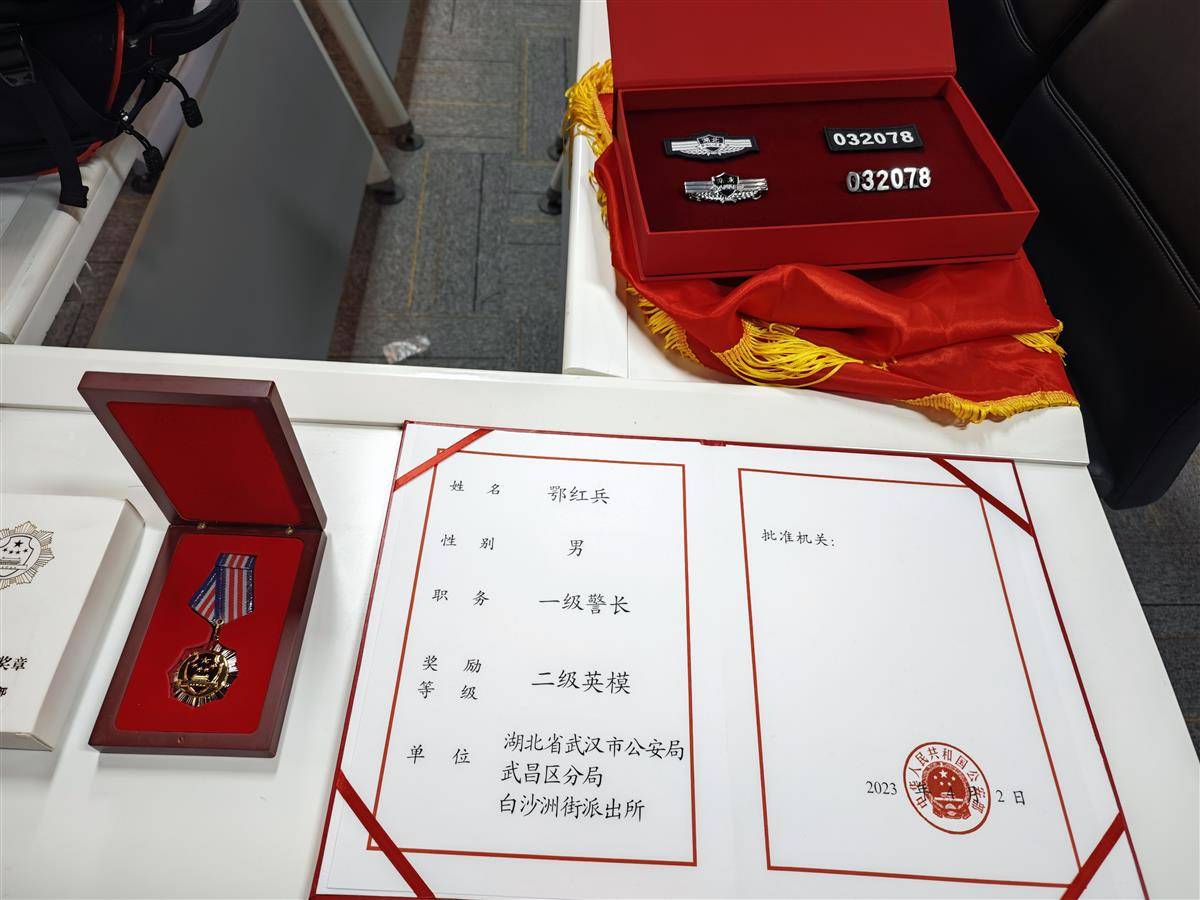 36年来,鄂红兵先后荣立个人三等功1次,被市局嘉奖12次,牺牲后被湖北省公安厅追记一等功,2023年4月被公安部追授全国公安系统二级英雄模范称号,2024年1月被追授“湖北省道德模范(敬业奉献模范)”称号、2023年度“武汉最美基层民警”称号。
