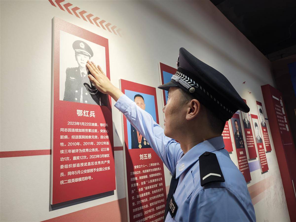 仪式在雄壮的《中国人民警察警歌》中结束。武昌区分局白沙洲街派出所青年民警、鄂红兵生前徒弟付涛说,师父长年扎根基层,默默奉献一心为民,他的言传身教让我受益终身。武昌区分局粮道街派出所青年民警刘靖荷表示,我将以鄂红兵同志为榜样,在缅怀中传承,在铭记中奋进,答好新时代给我们公安青年的赶考答卷。