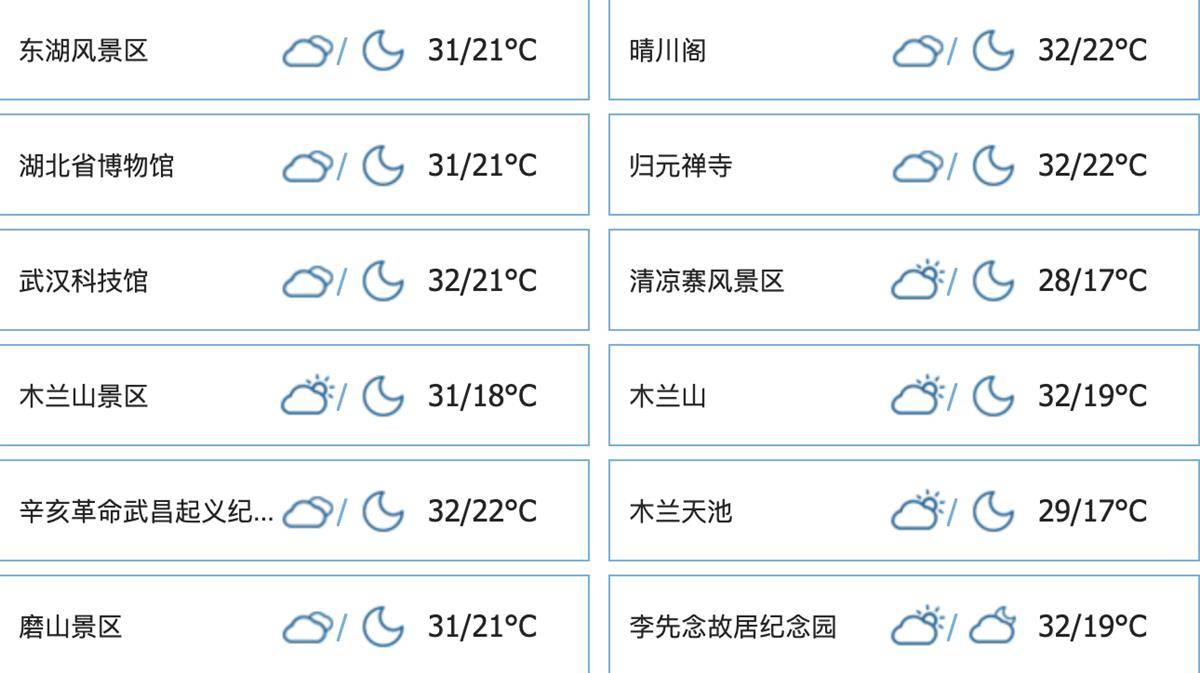 昨天武汉市晴天到多云,大部地区最低气温17℃~20℃,最高气温31℃~33℃;今天早晨武汉市多云,大部地区最低气温18℃~22℃。