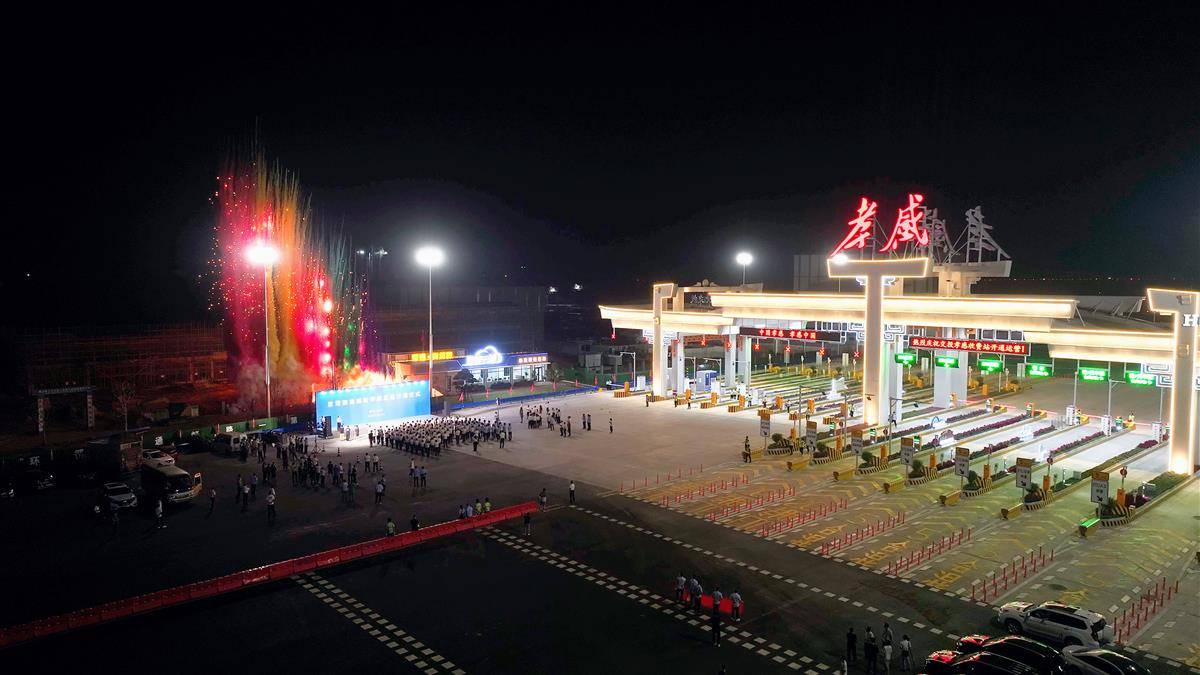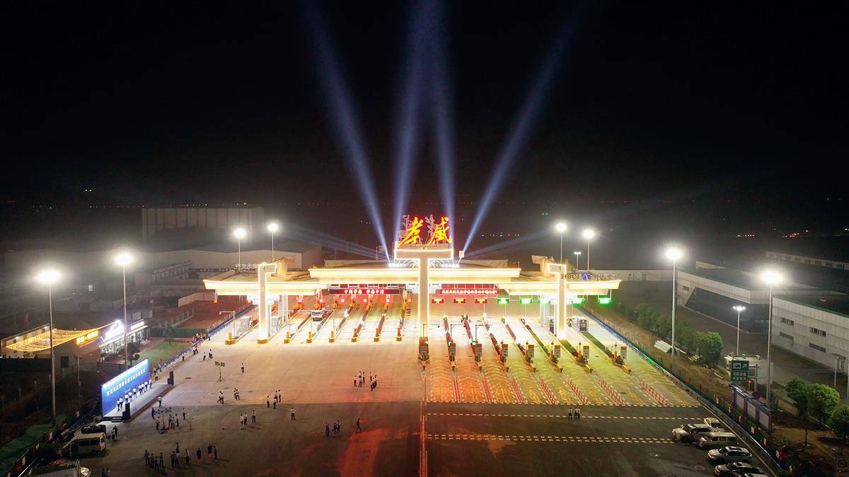 夜幕下,孝感收费站外观简约古朴,造型庄重大气,配合多层次灯光设计,古典与现代元素交融,展示出中华孝文化名城韵味和与时俱进的现代城市特色。