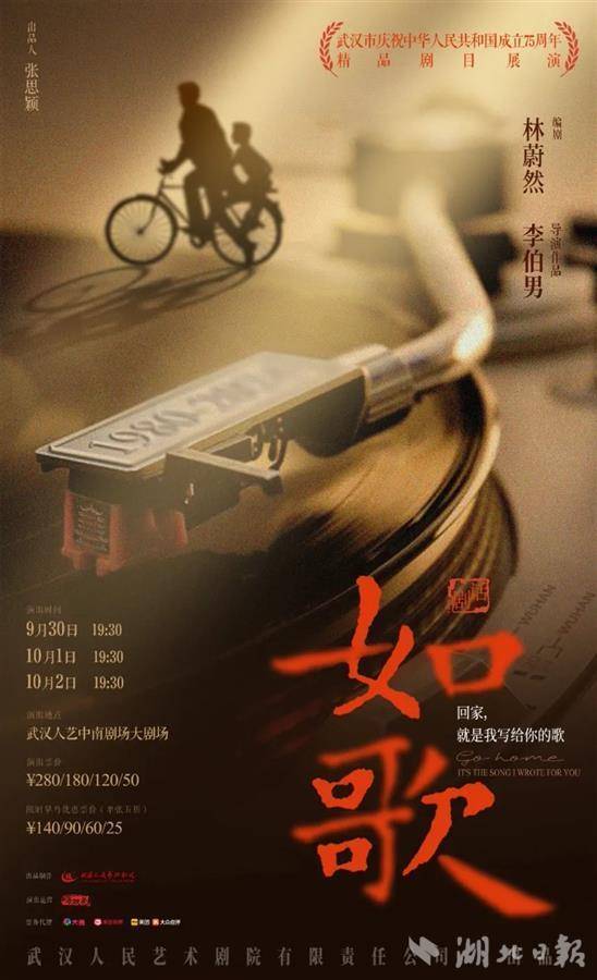 假期里,武汉人民艺术剧院共为观众准备了20场精彩演出,涵盖了话剧、木偶剧、儿童剧、实景木偶剧等。其中,话剧《如歌》是该剧的首演,9月30日晚在中南剧场上演;10月1日至10月7日,实景木偶剧《大禹晴川情》将在每晚7点半在晴川阁上演。