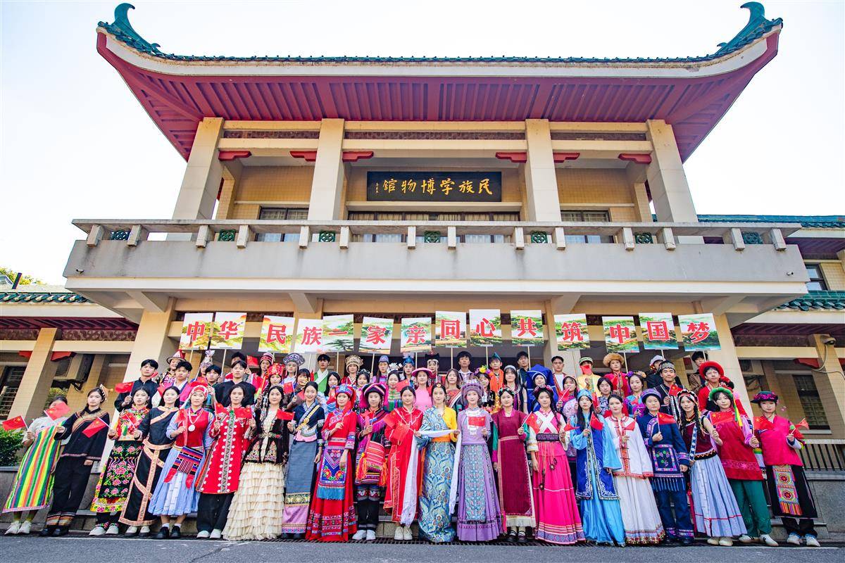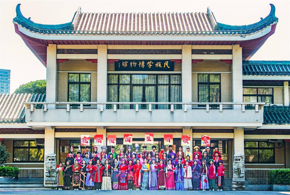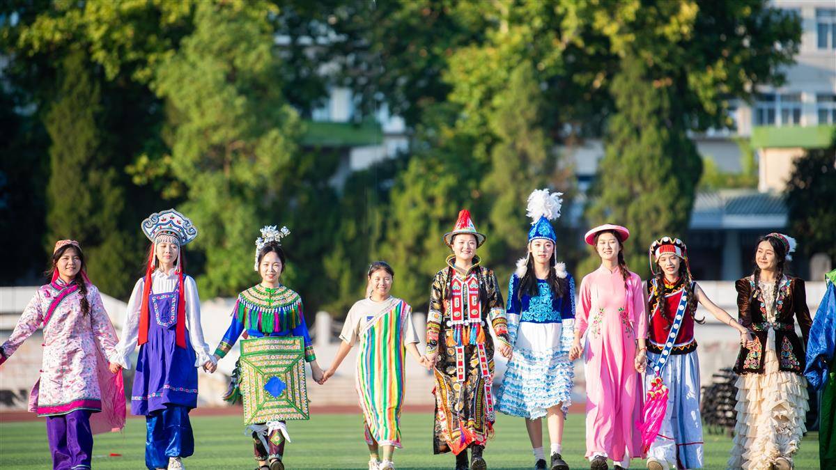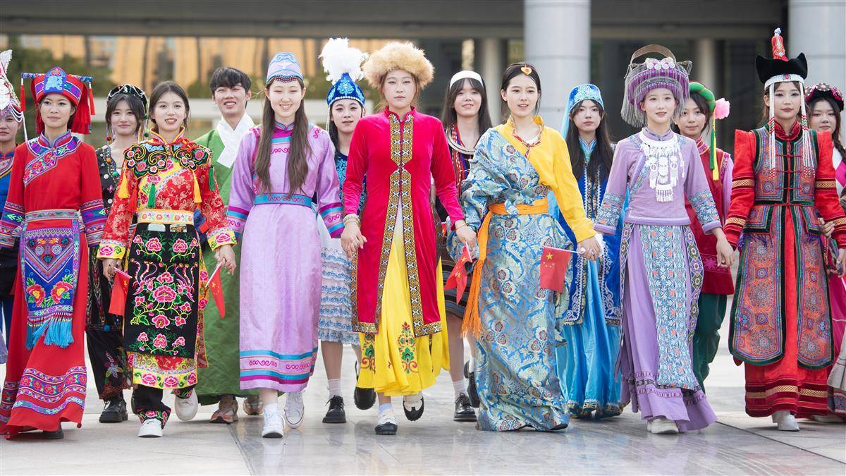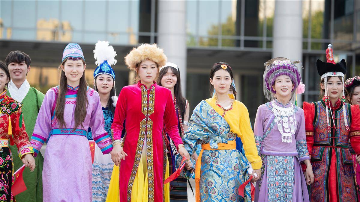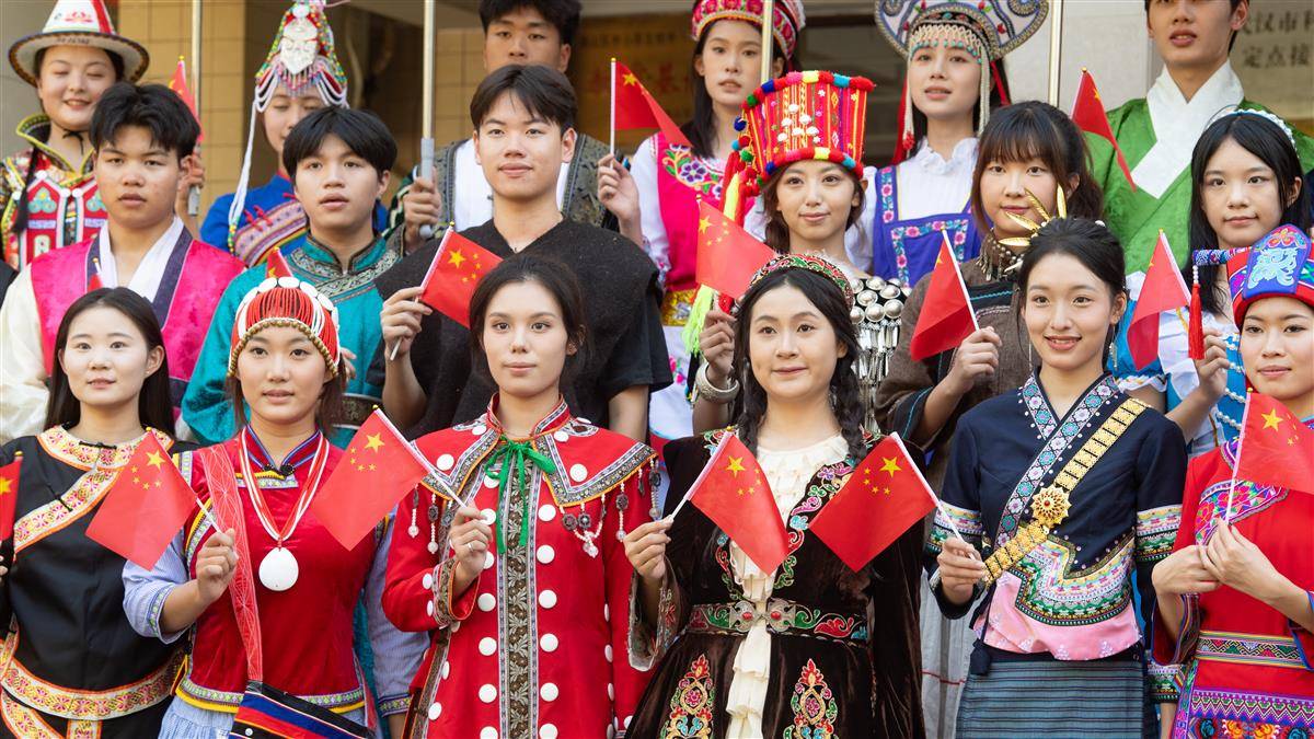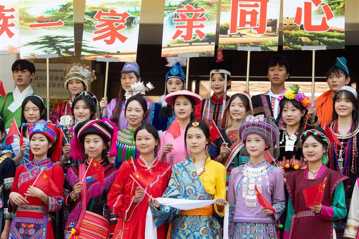 2024年9月29日,中华人民共和国成立75周年到来之际,中南民族大学的学生们身着56个民族的传统服饰,手持国旗,像石榴籽一样紧紧相依拍下合影,祝福祖国母亲生日快乐!(湖北日报全媒记者何宇欣通讯员龙华摄)