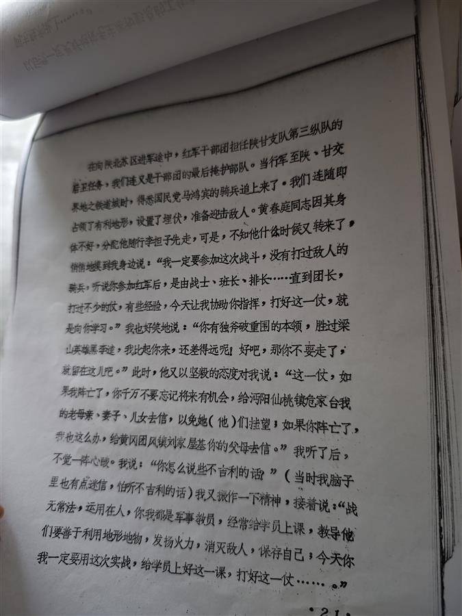 “父亲是惦记着我们的。”她翻到一页,上面写着:“此时,他(黄春庭)又以坚毅的态度对我(刘少卿)说:‘这一仗,如果我阵亡了,你千万不要忘记将来有机会,给我的老母亲、妻子、儿女去信,以免他们挂望;如果你阵亡了,我也这么办,给你的父母去信……’”
