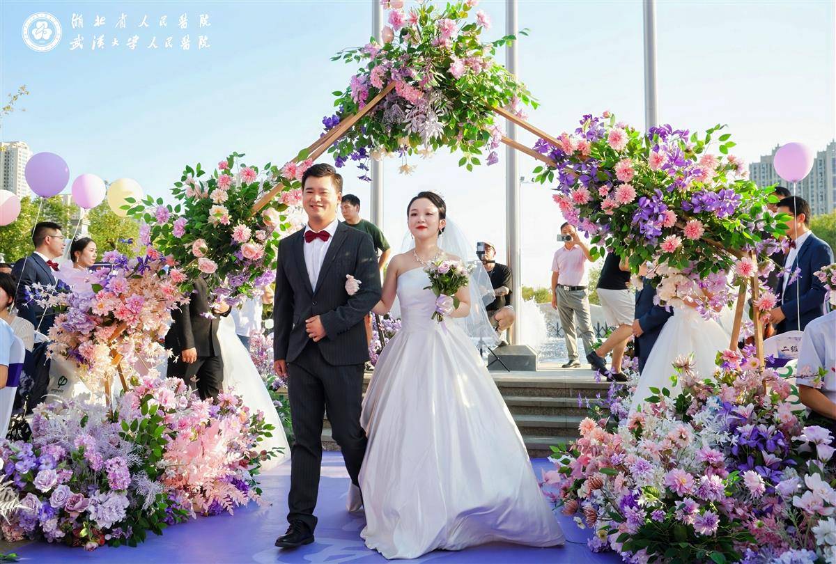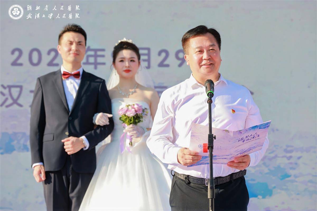 婚礼现场,武汉大学人民医院党委书记万红慧为15对才子佳人主婚,并代表医院为他们送上最真挚的祝福。“今天是二十九号,寓意爱情恒久。金秋时节,医院喜事连连——洪山院区正式启用服务社会、全球首颗医学遥感卫星‘武汉大学人民医院健康号’成功发射入轨、本次人民医院第六届集体婚礼,可谓是与祖国共襄盛举、为健康事业锦上添花。”万红慧说,希望新人们在医院的新百年征程中,将小家与国家紧密相连,坚守时代使命,不负人民重托,以赤子之心,续写服务人民生命健康的辉煌篇章。