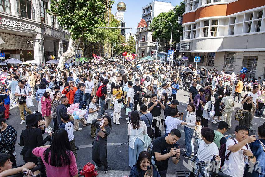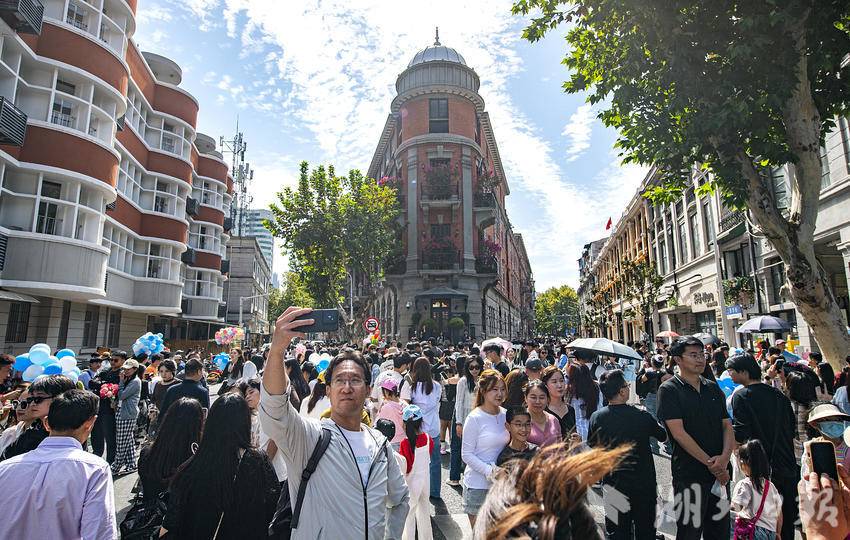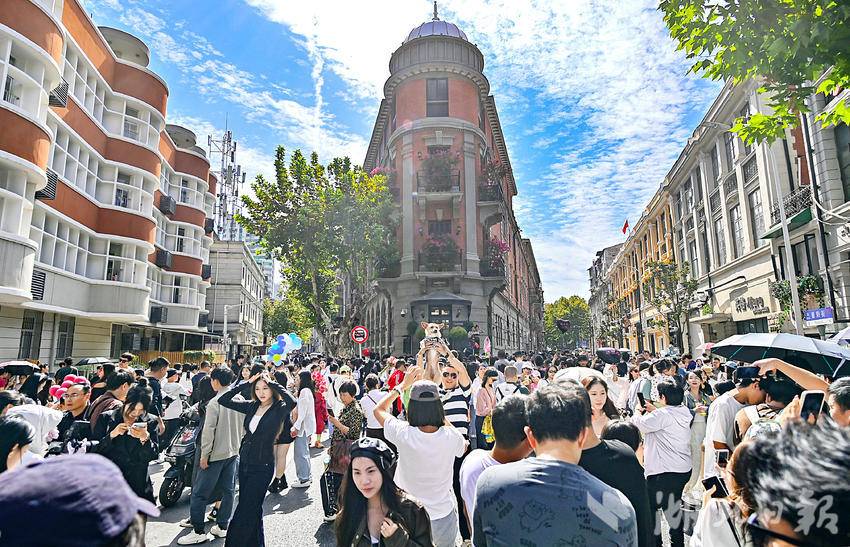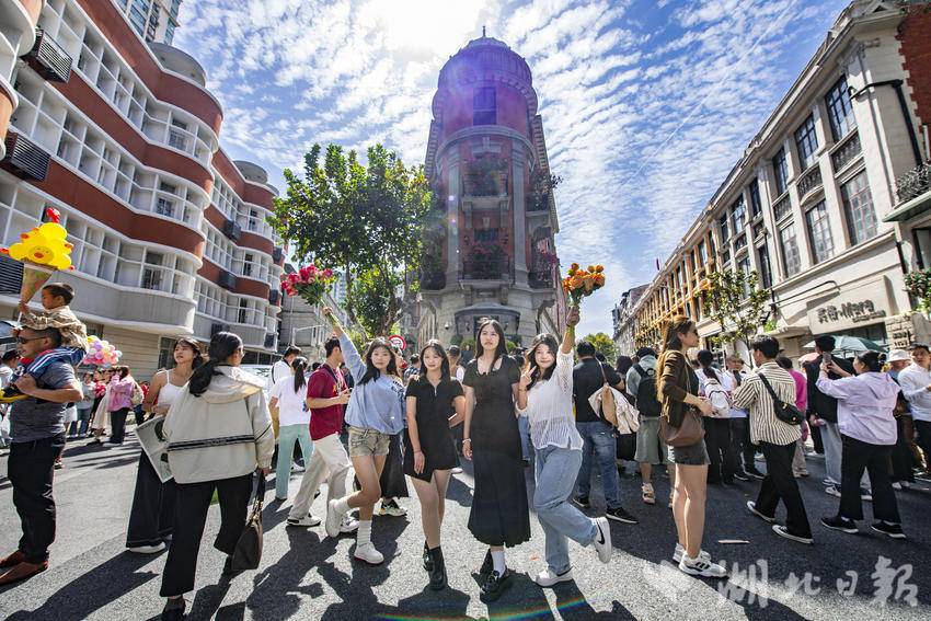 10月2日,俊男靓女、网红、摄影师、主播、作家、文化名流以及游客等云集武汉巴公房子旁边的街道,人山人海,热闹非凡。如今,巴公房子成为武汉旅游新的名片,已成为顶流网红打卡地。(湖北日报全媒记者 朱熙勇 摄)