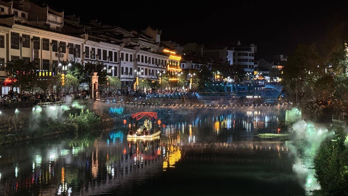晚上7点30分,九资河畔音乐响起,光影闪烁,悠扬的《梦回鸠兹》夜游光影演绎,让千年古镇变得流光四溢,美轮美奂,仿佛穿越了千年。河道中两条小船缓缓前行,身着古装的演员随着音乐翩翩起舞。