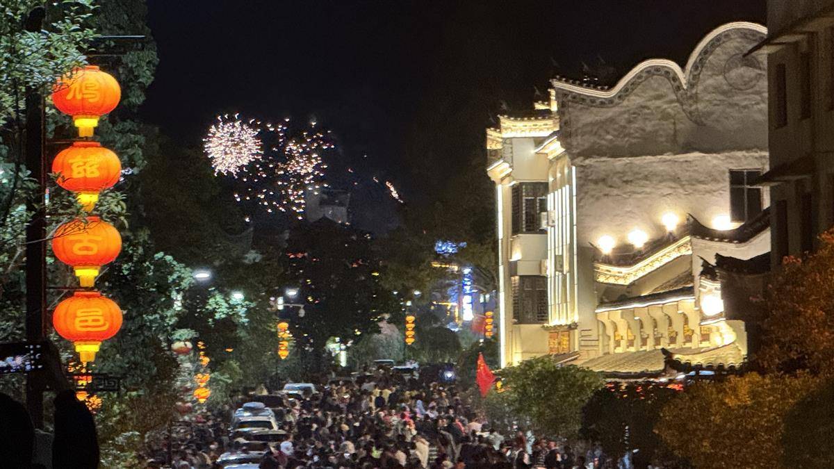 10月2日晚,大批游客聚集在罗田九资河镇鸠兹古邑文旅休闲街,欢度国庆假期,或漫步街头“逛吃”,或欣赏两岸小桥流水人家的景色……
