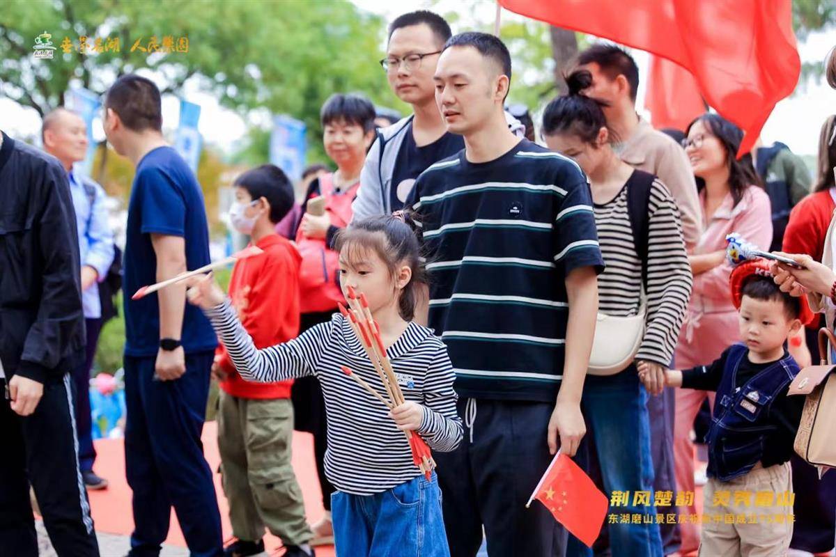 磨山景区同样国风浓厚。楚天台上奏响古乐版《我和我的祖国》,由编钟、编磬、埙、古筝、箫等乐器合奏,游客们不约而同挥舞起手中国旗,一同歌唱起来。