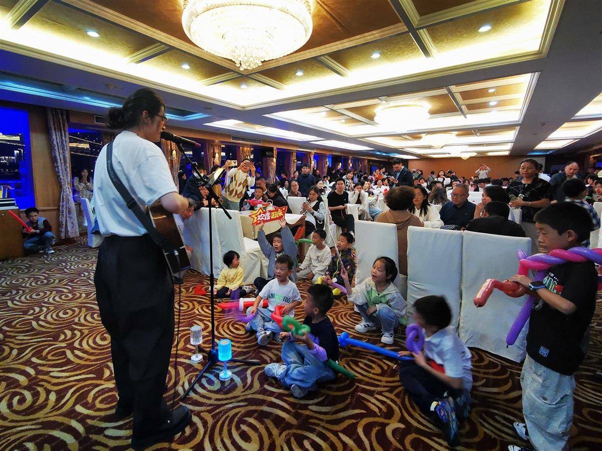 身着五颜六色,奇形怪状服饰的小丑来到三楼甲板,向大“朋友”们秀出幽默,给小朋友讲故事,变魔术,还会用气球变出各种小礼物,滑稽的动作、夸张的表情和幽默的语言让孩子们捧腹大笑,大家争相拍照打卡,现场成为一片欢乐的海洋,陪伴游客们度过了一段轻松愉悦的假期。“我是第一次带小孩来到武汉旅游,本来想着看看长江的夜景,拍拍照、吹吹江风,没想到游船上还有这些精彩的活动,我们家小朋友开心得都不想离开了”,来自湖南的谢先生说。