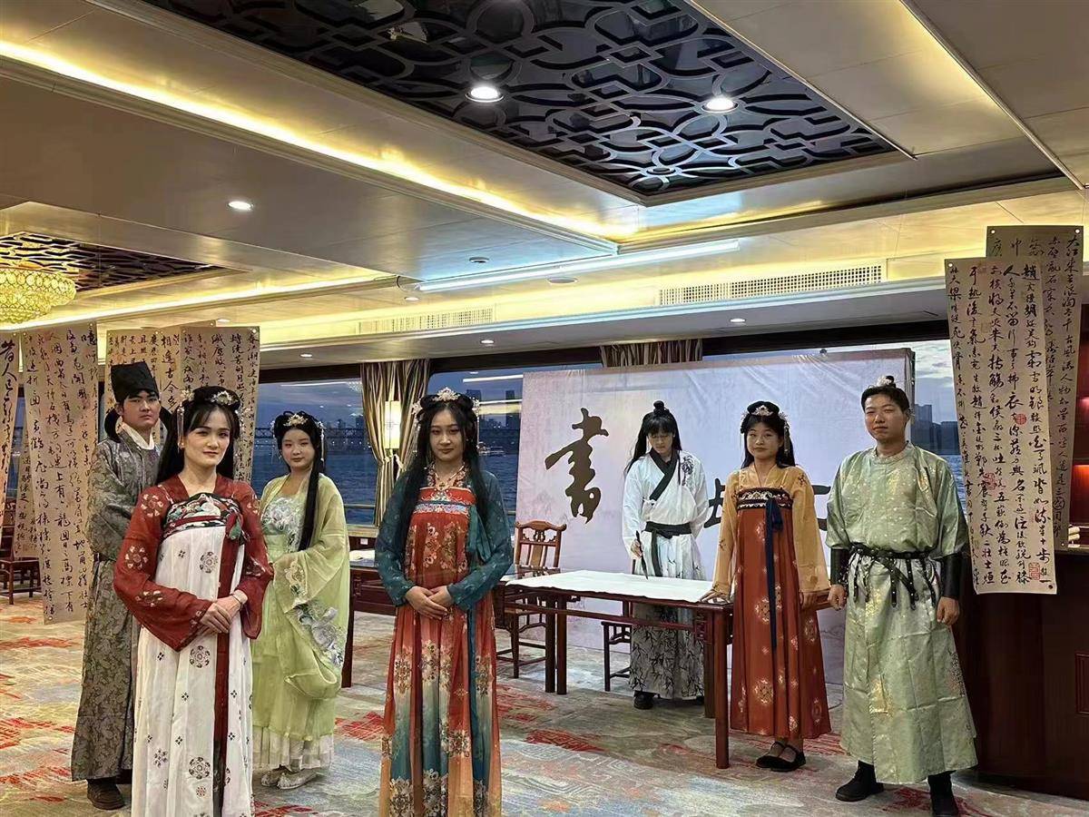 两江游览十一艘豪华游船盛装焕新,迎风飘扬的“中国红”在江面上格外醒目,点亮了江城的夜空,游客徜徉其中,感受浓浓的节日氛围。在汉阳门码头“李白号”游船上,“诗书乐 说长江”——文化汇演上新,工作人员身着古风汉服,让大家梦回盛唐,以诗会友。整场汇演用书写的诗词、灵动的乐曲和咏颂的诗歌,诉说出诗仙李白与长江的故事。通过沉浸式体验,让游客在互动性和代入感中品味长江文化,惊艳广大外地游客。