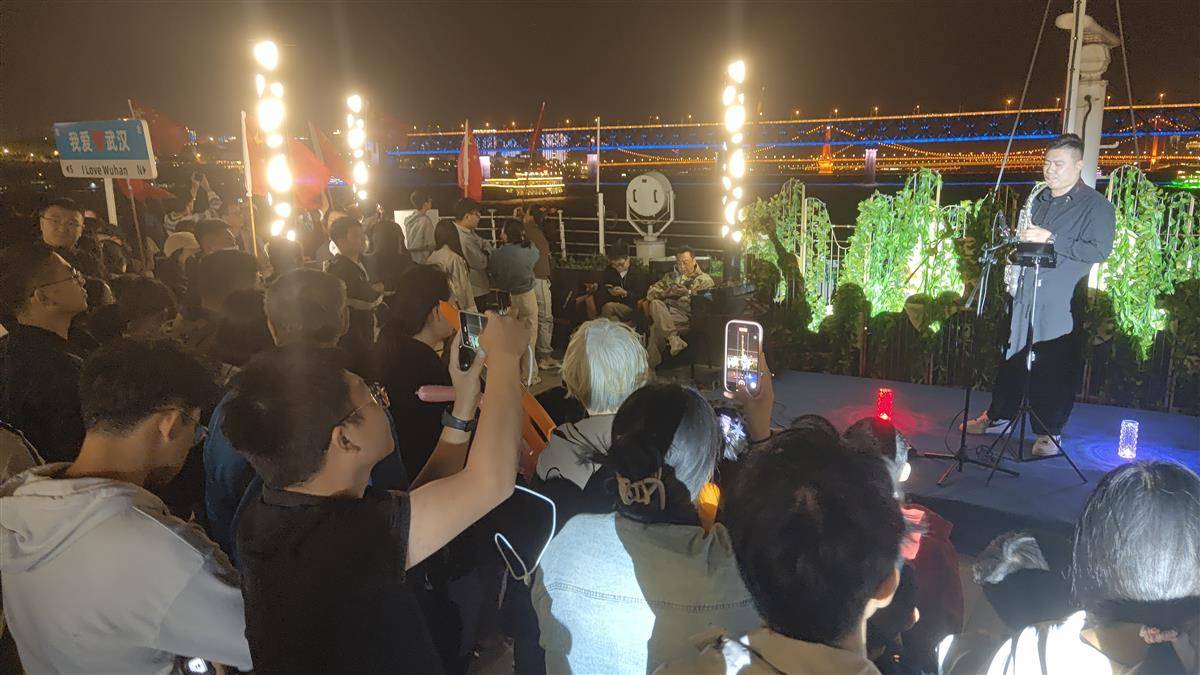 悠扬的旋律响起,汉阳门码头“东湖号”与粤汉码头“两江晴川”游船上“歌唱祖国”专场音乐会开唱。民谣歌手带来怀旧名曲,另外还有吉他、萨克斯演奏,音乐的魅力变得具象化,随着《我爱你,中国》那熟悉而动人的旋律缓缓响起,在场的所有人纷纷不由自主跟随演唱者深情和唱。
