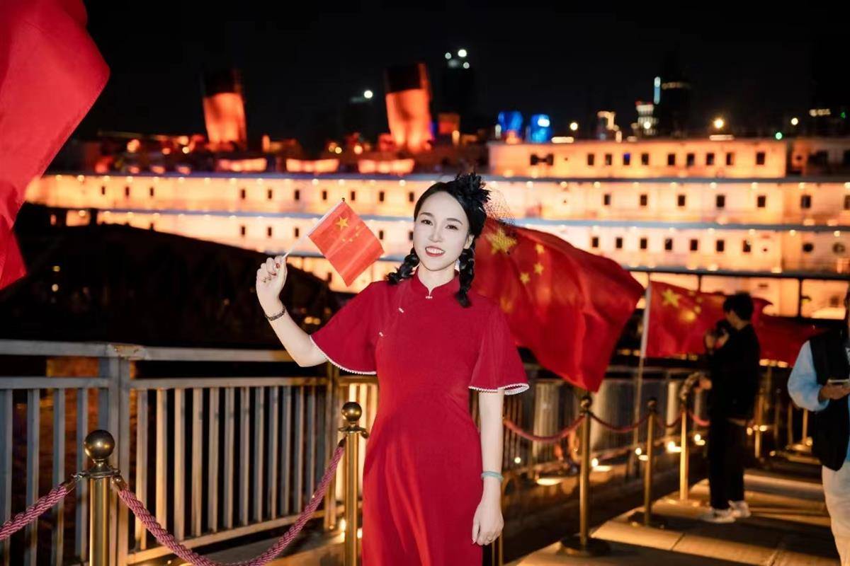 登上甲板,高楼鳞次栉比,国庆主题灯光秀璀璨夺目,瑰丽多彩的城市画卷在观众眼前徐徐展开,大家纷纷挥舞着手中的小红旗,对着江水喊出对祖国的热爱。
