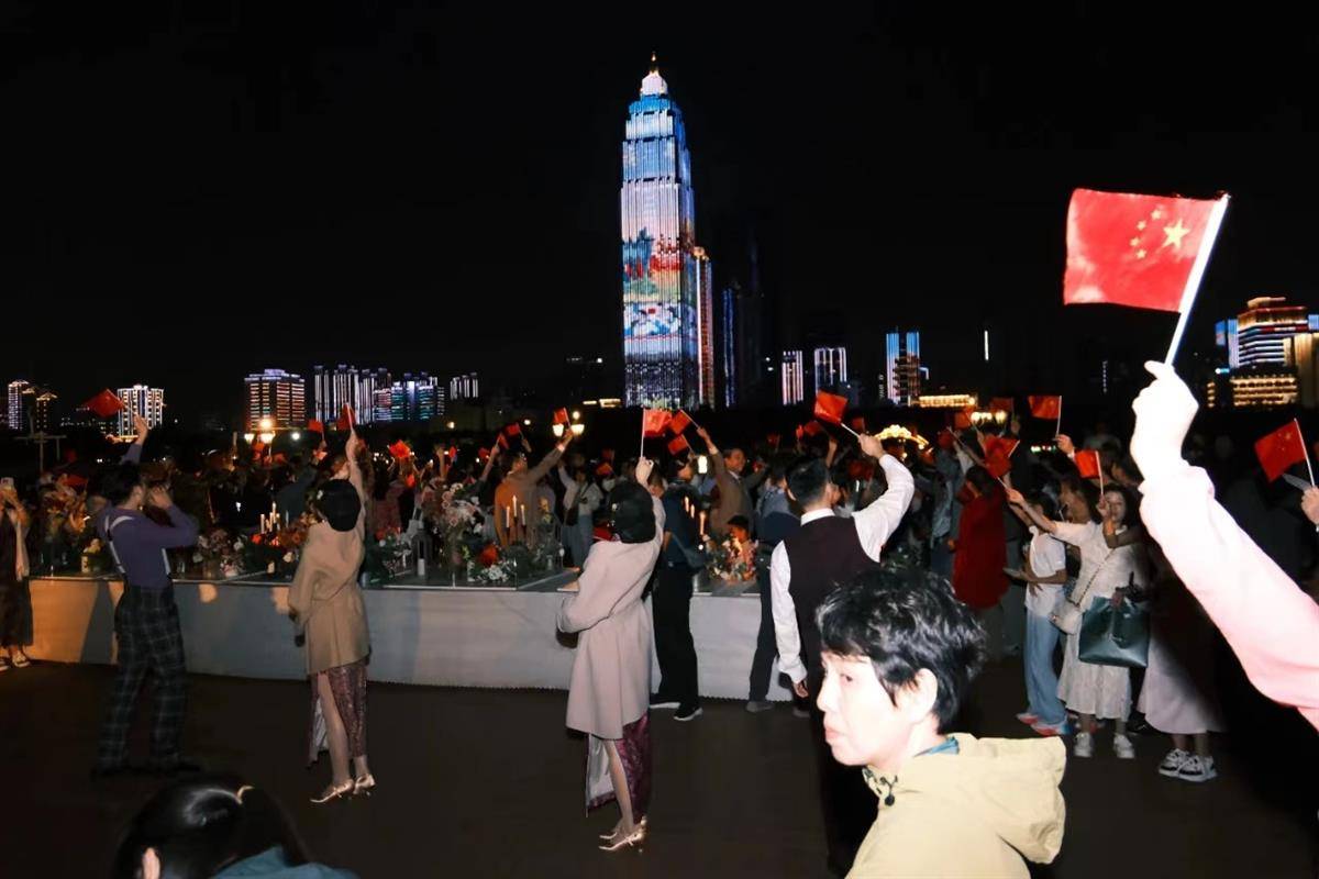 入夜时分,来观看《知音号》演出的朋友也收获了一份小小快乐:人手一面小国旗,让江流上涌起红色浪潮。