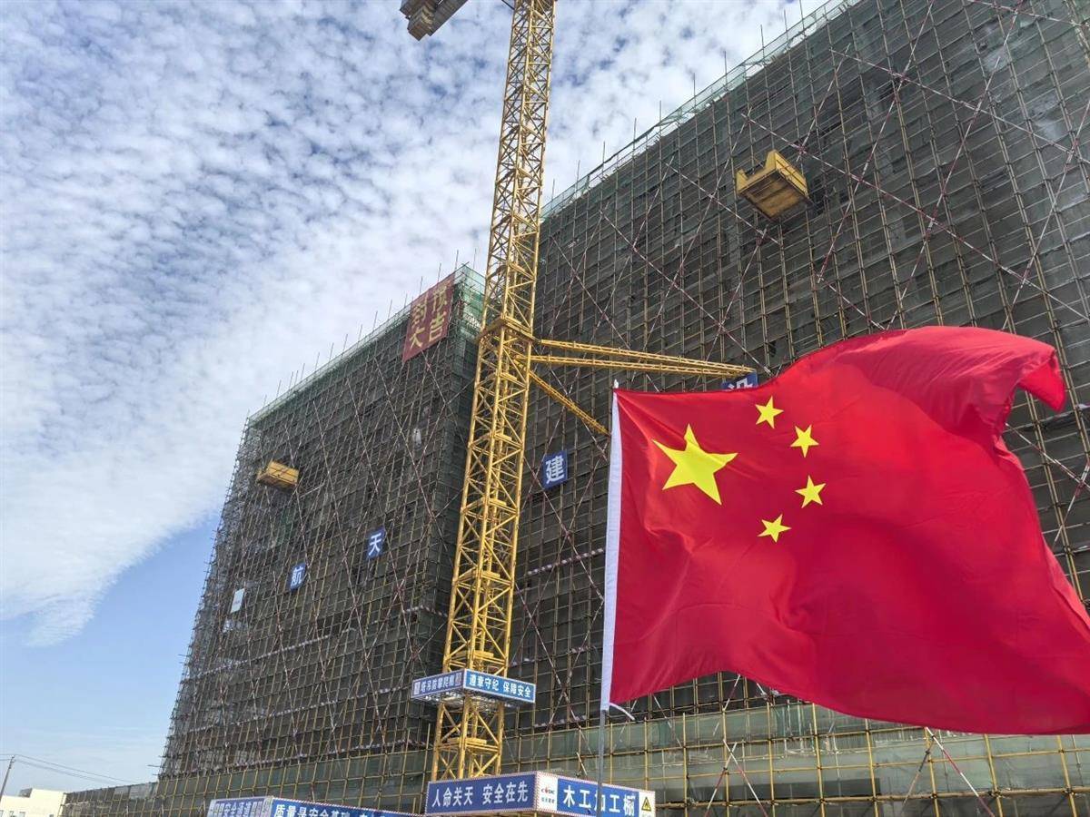 湖北日报讯(记者刘畅、通讯员唐诗)红旗漫卷迎国庆。10月1日,位于武汉市新洲区的武汉国家商业航天产业园内,快舟火箭产业园保障楼项目顺利封顶。