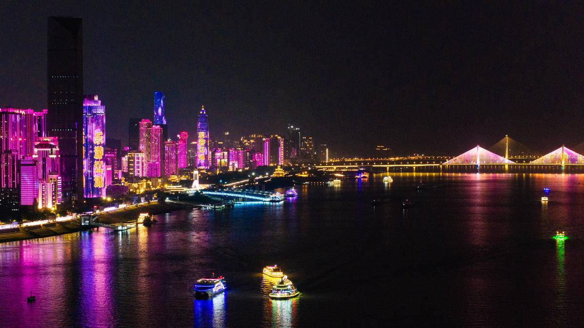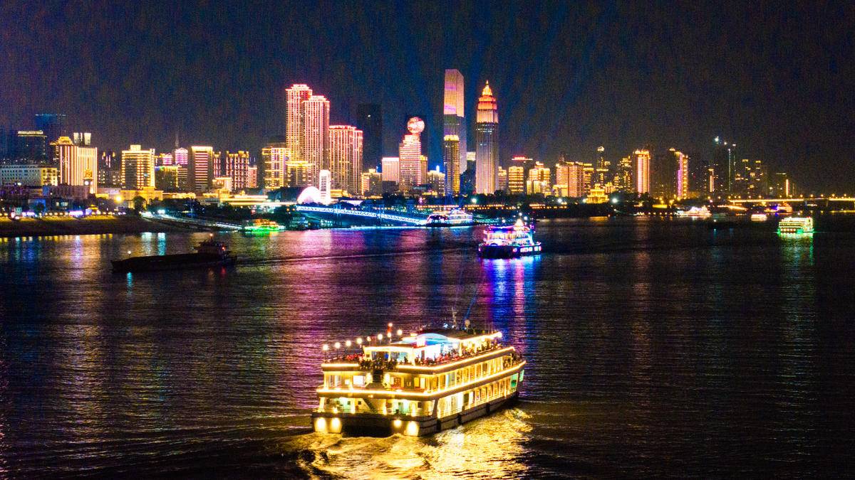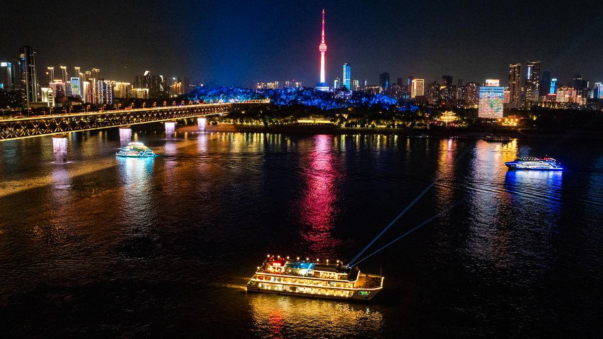2024年10月4日,国庆小长假第四日,夜幕降临,武汉两江四岸华灯璀璨,十余艘游船满载着八方宾客夜游长江,游客们吹着江风,一赏江城壮美夜景。(湖北日报全媒记者 何宇欣 摄)