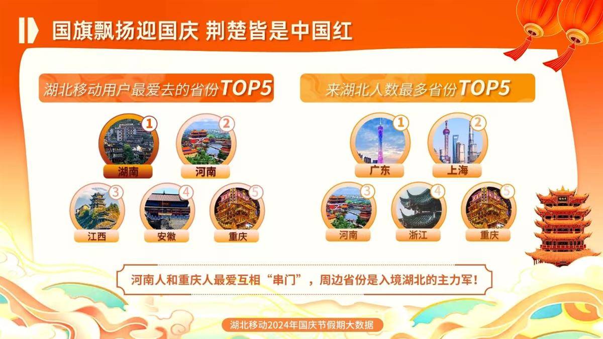 湖北日报讯(记者刘天纵、通讯员王政)10月8日,中国移动湖北公司发布了《2024国庆假期大数据报告》,在2024年最后一次“旅游大迁徙”中,湘鄂赣、鄂渝、鄂豫游客双向奔赴,跨省邻近城市“交换旅游”热情拉满。