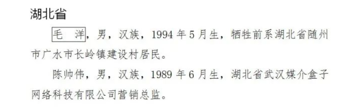 毛洋,1994年出生,生前是广水市长岭镇建设村居民。今年8月20日晚7时许,毛洋坐在广水市徐家河内河岸边的台阶上乘凉,附近有2名儿童在河边捞鱼玩耍。突然,一名男孩不慎滑入水中,因河水较深,该男孩在水中不断挣扎且连呛了几口水。另外一名儿童随即站在河边大声呼救。循着呼救声,毛洋立即前往河边进行救援。在岸边,毛洋尝试借助两名儿童捞鱼使用的抄网将落水儿童捞至岸边,因距离较远未果。毛洋随即跳入3米多深的水里,游了十余米后到达落水男孩身边,奋力将他救到岸边。由于救人体力不支,毛洋不幸牺牲。