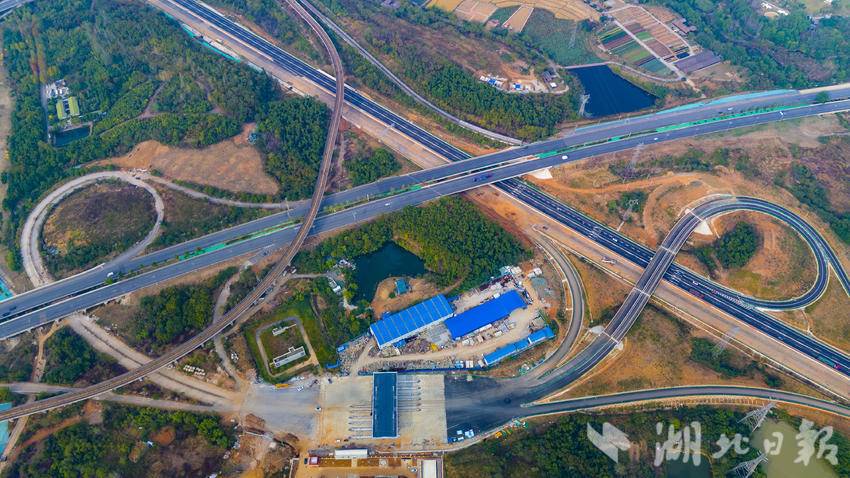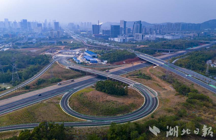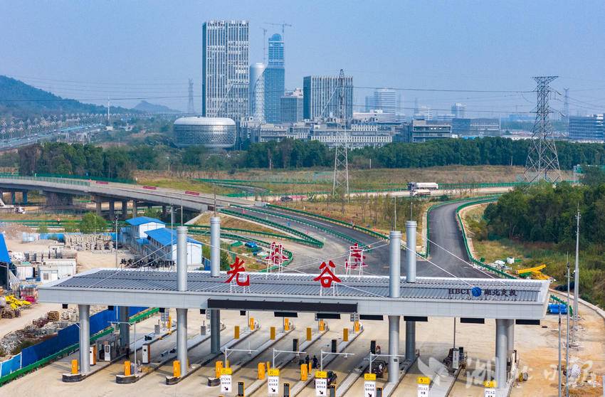 10月10日,俯瞰绕城高速光谷收费站和互通匝道已基本建设完成。这是武汉绕城高速公路改扩建工程的重要节点之一,工程全长30.3公里,由中洲至北湖段将双向四车道改扩建为双向八车道,该段也是武汉绕城高速与四环线共用路段。该工程建成后,对助推武汉城市圈交通一体化建设,促进沿线经济社会发展具有十分重要的意义。据悉,新收费站和互通匝道将在绕城高速中洲至北湖改扩建建设完成后一并投入使用。(湖北日报全媒记者 魏铼 摄)