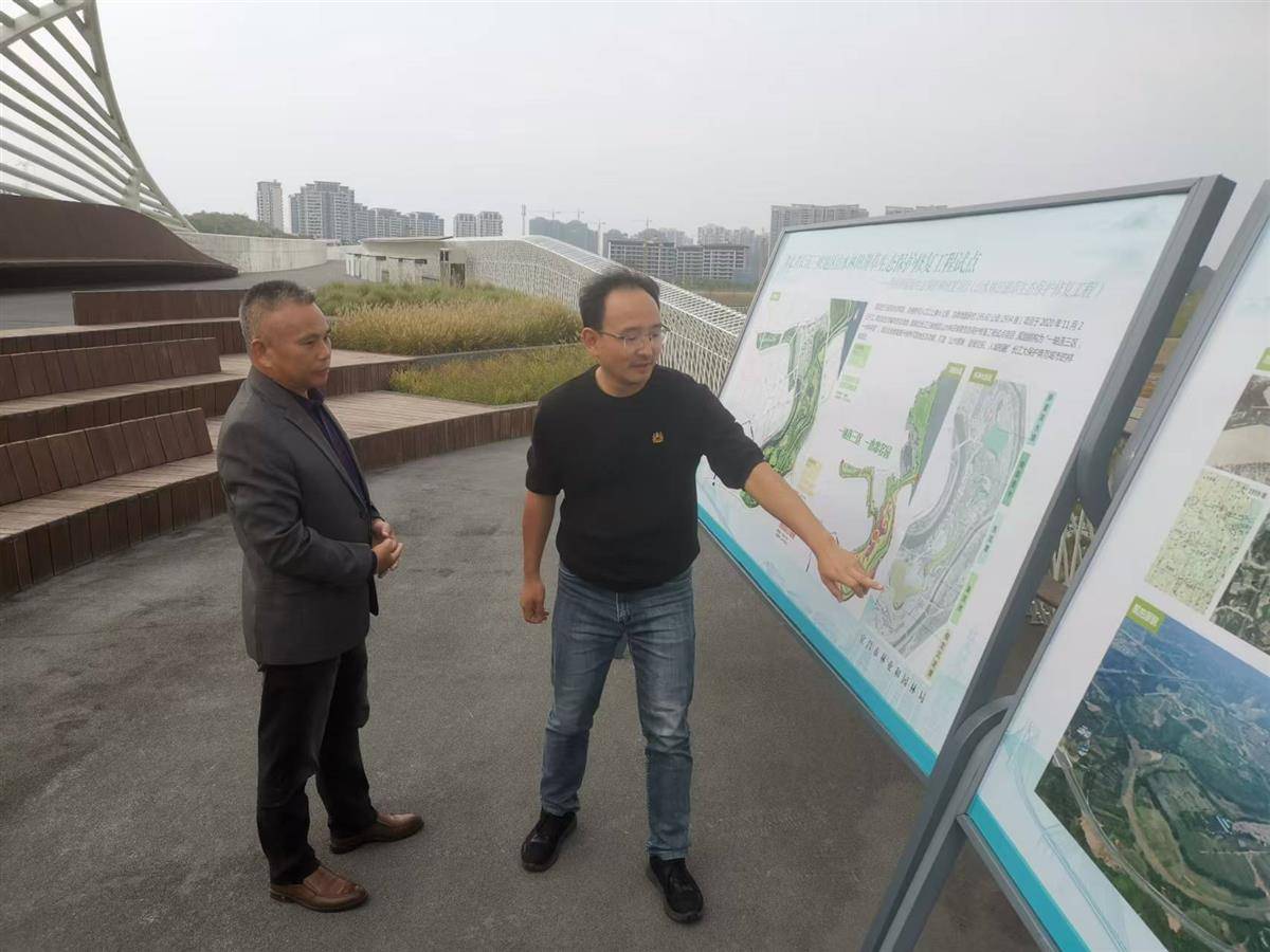 图为宜昌市自然资源和城乡建设局生态修复科的负责人刘翔,正在向现场调研的中南民族大学公共管理学院,土地资源管理系刘汉武介绍卷桥河湿地生态保护的情况。