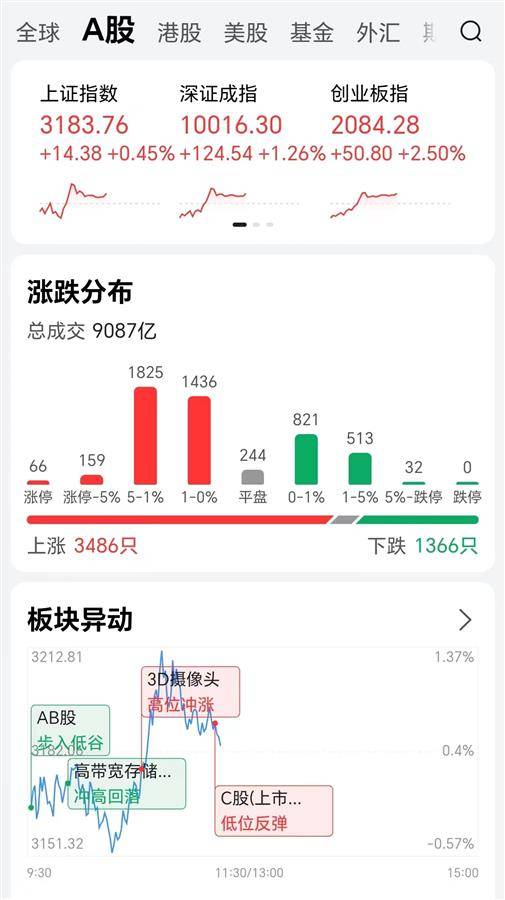 受两大政策利好影响,今天上午,A股三大指数飘红。截至上午收盘,上证指数上涨0.67%,深证成指上涨1.64%,创业板指上涨3.29%。