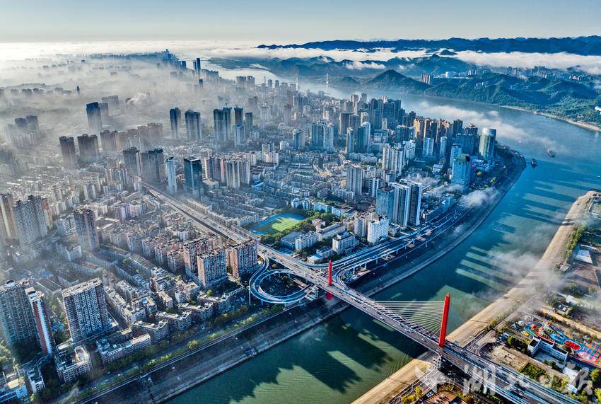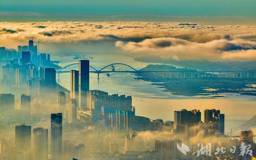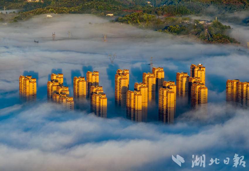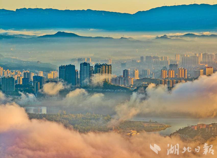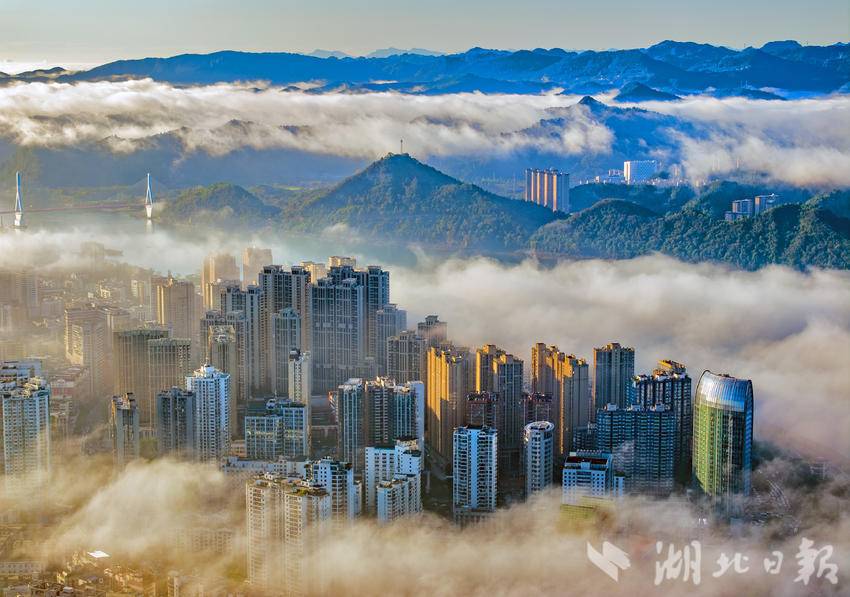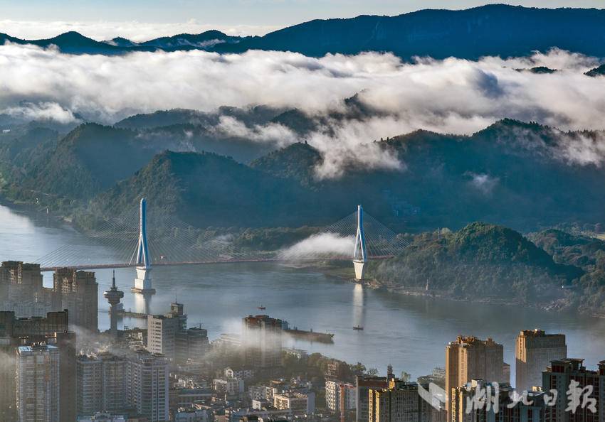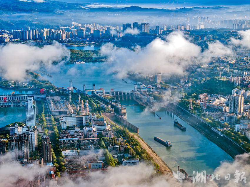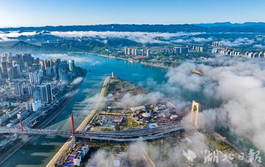 10月18日清晨,长江宜昌段出现入秋以后的第一场云蒸霞蔚的美雾景观。结束一场秋雨后,宜昌开始放晴,从空中俯瞰,整个城市在云雾缭绕中若隐若现,美轮美奂,长江两岸风景宛如仙境。(湖北日报全媒记者 刘曙松 摄)