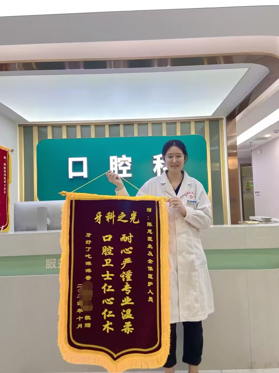收到锦旗后,平时非常害羞但服务热情、技术良好的陈医生表示,这是对她和整个口腔科团队工作的极大肯定和鼓励。她表示将继续秉承“以患者为中心”的服务理念,不断提高医疗技术和服务水平,为更多的患者带来健康和笑容。