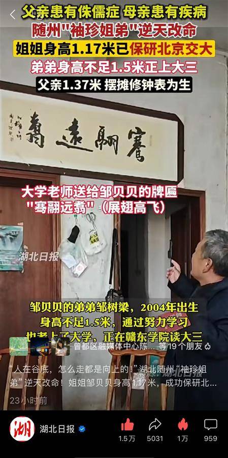 10月20日、21日,湖北日报全媒体报道了身高1.17米的随州“微微女孩”邹贝贝因先天疾病,虽家境艰难,却积极向上、努力求学,被保研北京交通大学的故事。