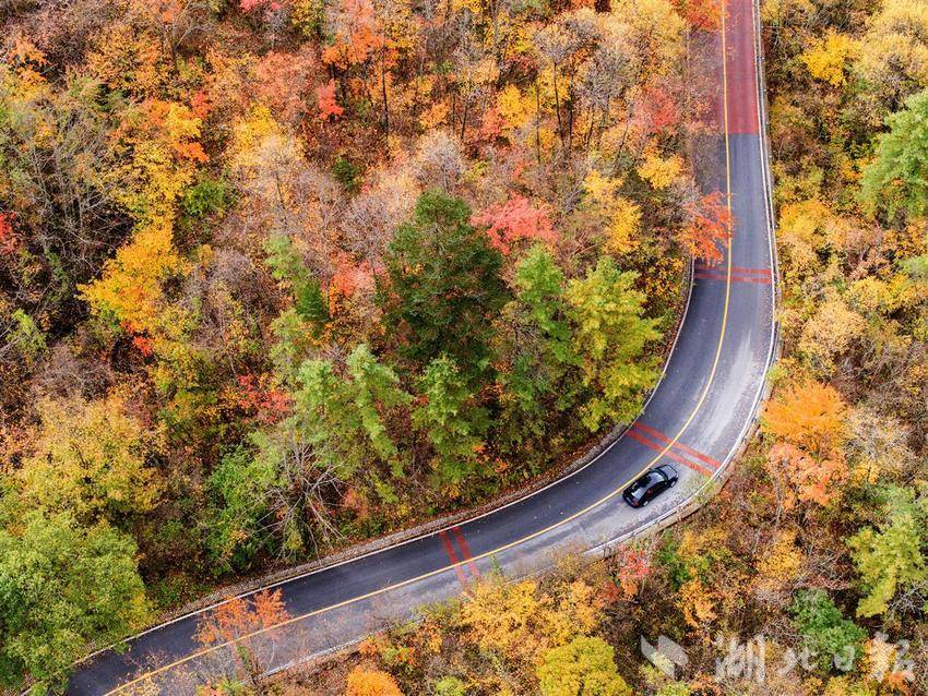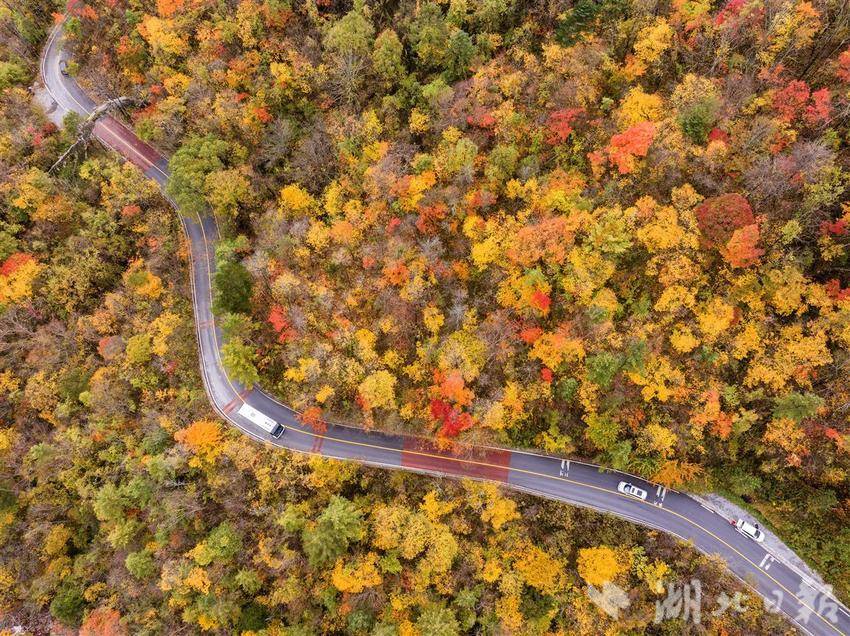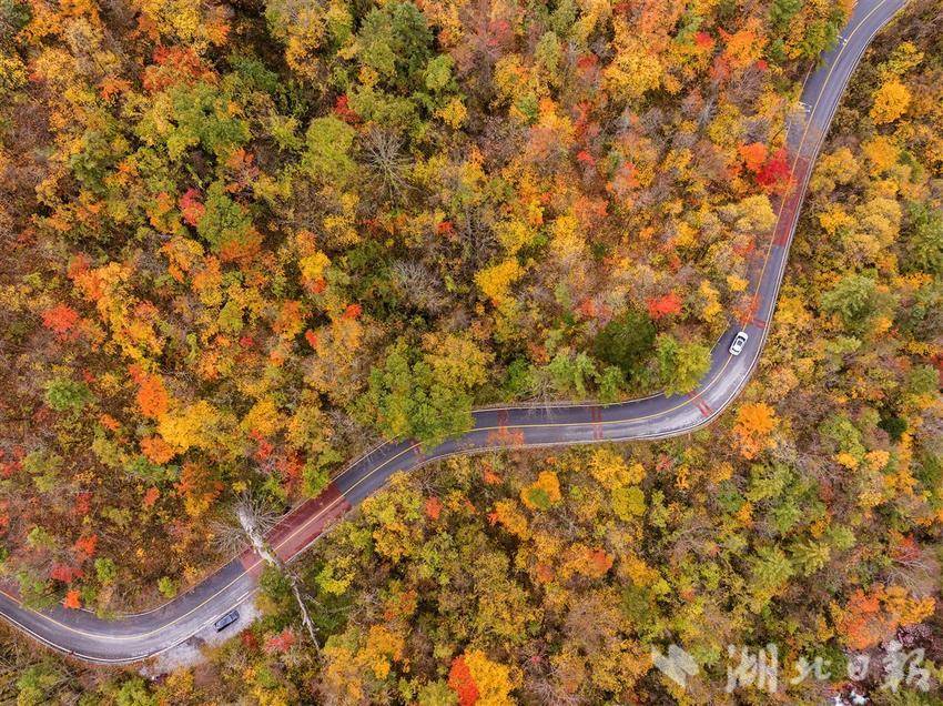 10月21日,车辆行驶在神农架林区神农顶的旅游公路上。时下,深秋时节,神农架林区到处红叶漫山,层林尽染,一幅幅动人的秋色图画美不胜收,令人留连忘返。(视界网 吴承忠 摄)