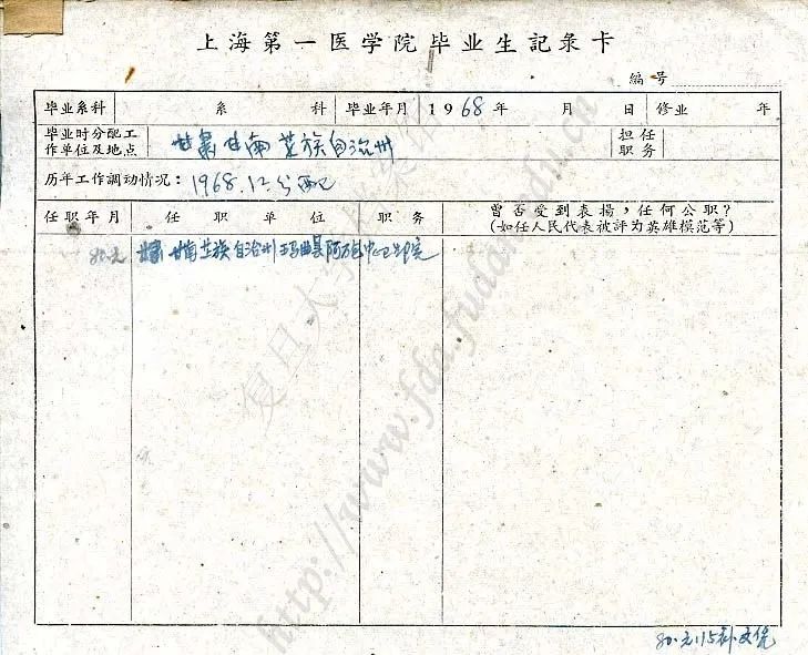 毕业生记录卡上记录了王万青的毕业去向:甘肃甘南藏族自治州玛曲县阿万仓中心卫生院。