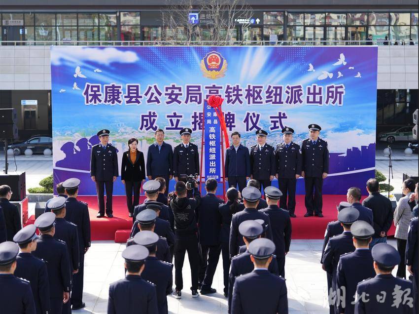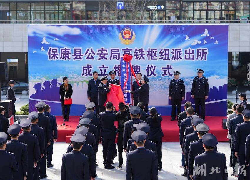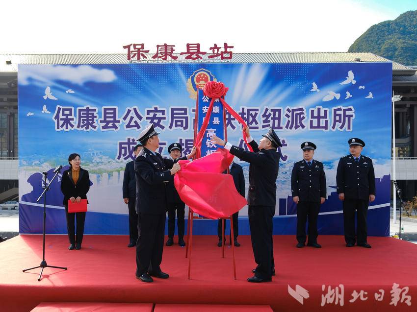 湖北日报客户端讯(通讯员邢忆星、樊世琦、李金荣)10月22日,保康县公安局高铁枢纽派出所成立揭牌仪式,在郑渝高铁保康县站站前广场举行。武汉铁路公安局局长朱梁与保康县委副书记、县长杜云峰出席揭牌仪式并致辞,县委副书记、政法委书记胡志芳主持揭牌仪式。