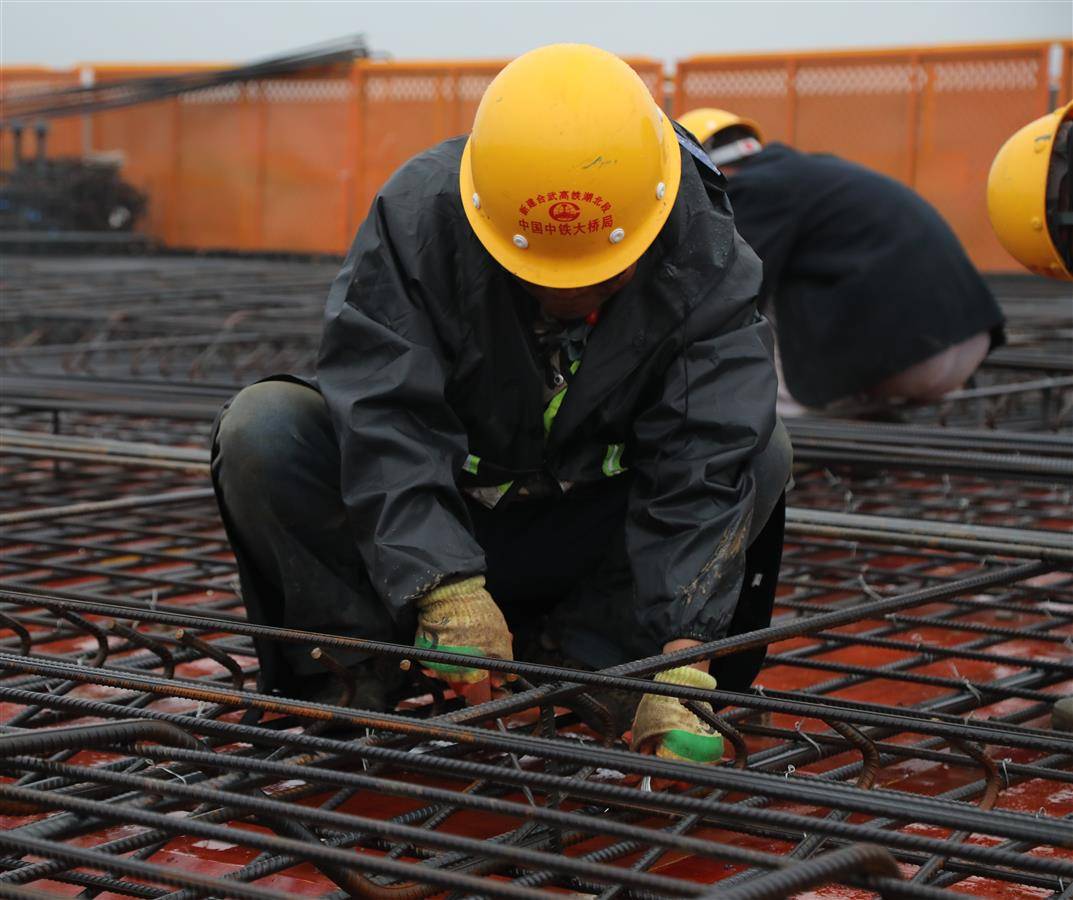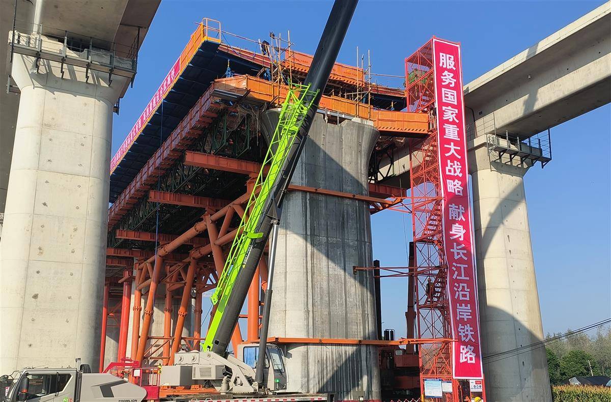 “距离仅3米左右,施工难度极大,算得上是‘见缝插针’。”中铁大桥局新建合武高铁湖北段项目部工程部副部长王文勇介绍,黄花涝府河特大桥全长约29.4公里,本次施工的813-814号位于该标段标尾,墩高约17.85米,重约731.8吨,采用支架法现浇施工。由于施工段与沪渝蓉高铁武宜段联络线并行,间距小,施工空间狭窄,且既有武宜联络线对地基沉降变形非常敏感,施工方在支架基础设计时只能尽可能利用施工桩基础的竖向刚度,在有限的空间里优化结构设计。