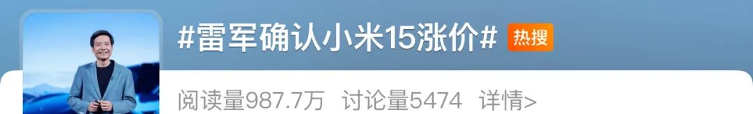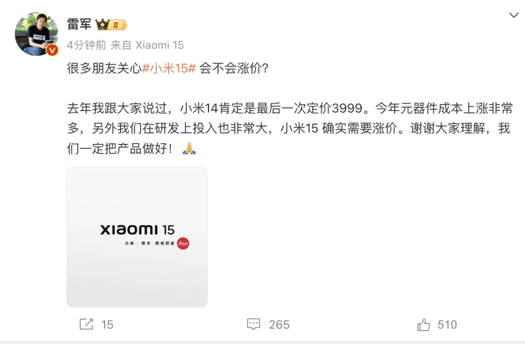 10月24日,雷军在微博发文:很多朋友关心小米15会不会涨价?去年我跟大家说过,小米14肯定是最后一次定价3999。今年元器件成本上涨非常多,另外我们在研发上投入也非常大,小米15确实需要涨价。谢谢大家理解,我们一定把产品做好!